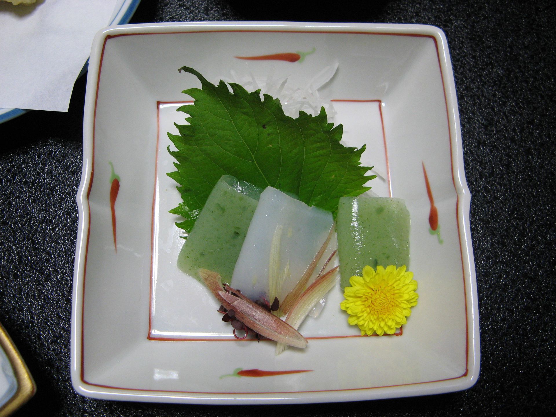 Zelf at ik daar voor het eerst gomatofu of sesamtofu, wat helemaal geen tofu is, maar er als tofu uitziet en is gemaakt van kuzu (een bindmiddel verkregen uit de wortels van de Japanse kuzuplant), sesamzaad, water en een beetje zout. Het hierdoor geïnspireerde recept staat op pagina 68 in het Japanse kookboek Japan in je pan.