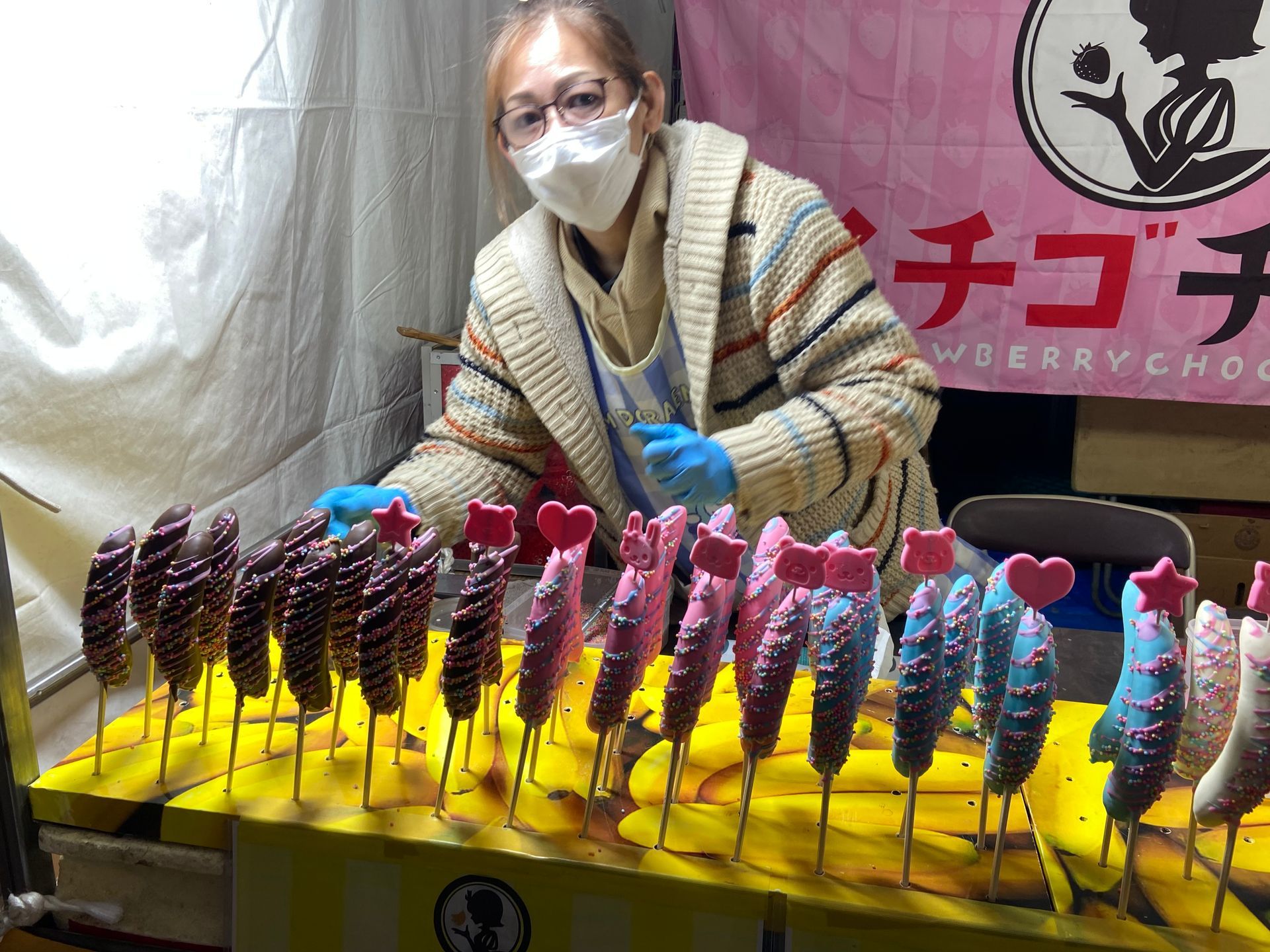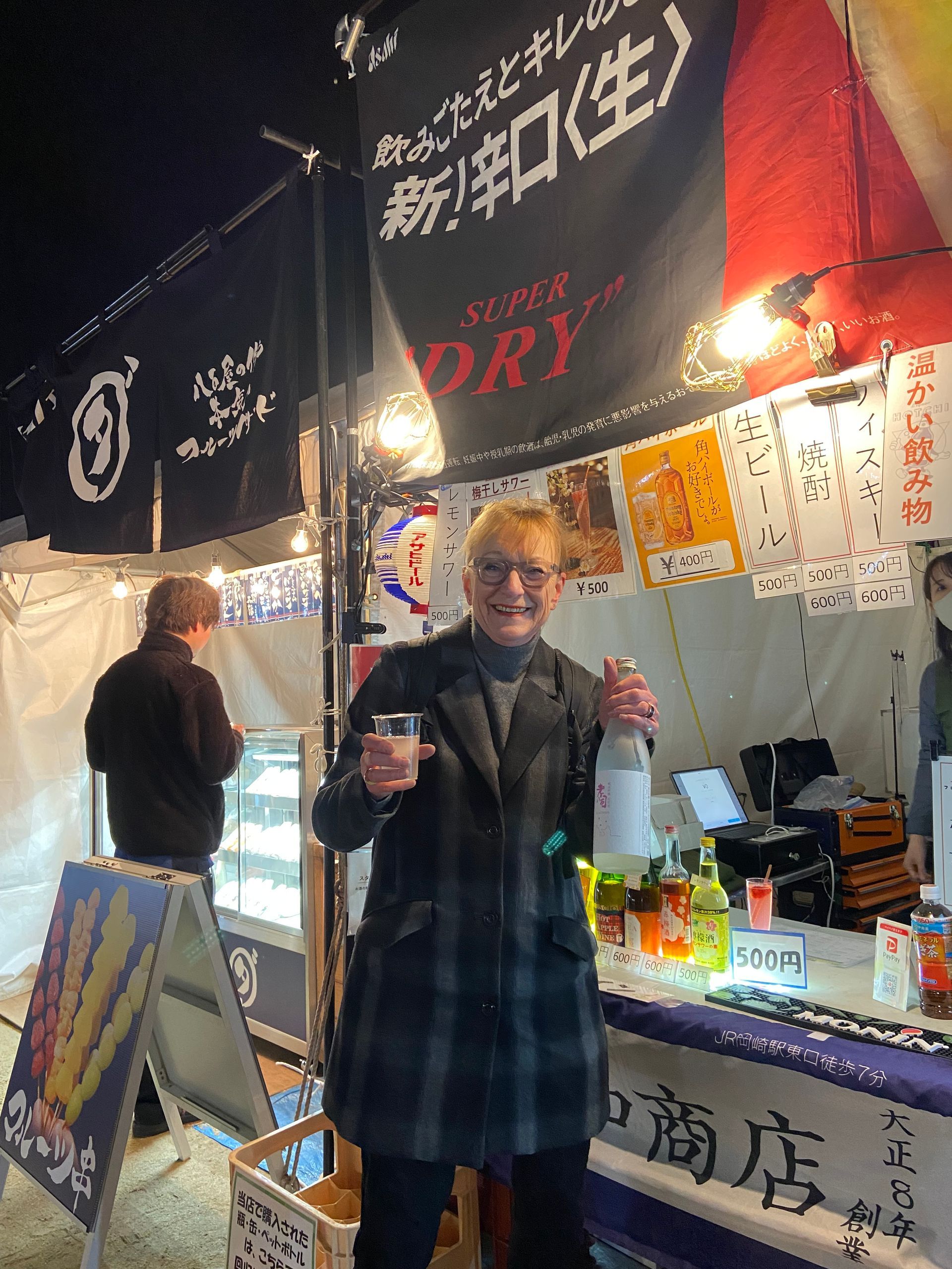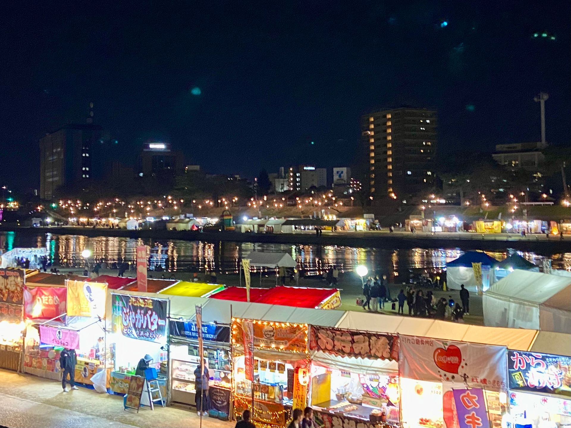 Aan beide zijden van de rivier stonden tientallen eet- en drinktentjes. Omdat er nog nauwelijks iets bloeide, was de speciale verlichting niet aan. Alleen de gebruikelijke lantaarns. Niet alle spotlights en dergelijke die normaal gesproken in verschillende kleuren de bloeiende kersenbloesembomen verlichten. Verkleumd kwamen we van die schuit af, want meer dan dat was het niet. Het was toch leuk. We dronken wat, speciale sake uit Okazaki. We aten wat, iets met soba, ei en een soort pannenkoek en (veel te veel) saus en mayo. Als dessert chocobanaan. Uiteindelijk gingen we weer met de bus naar huis.