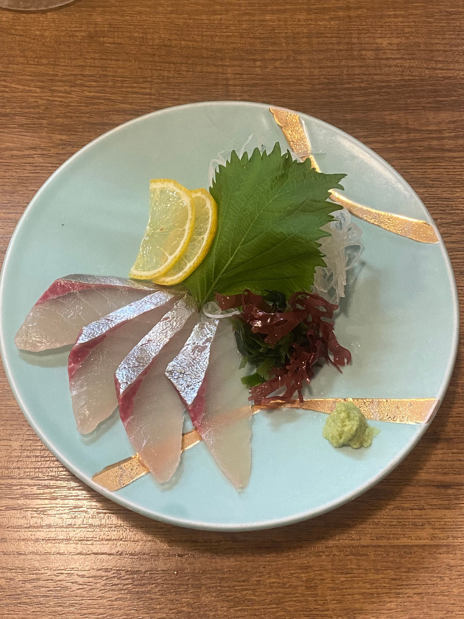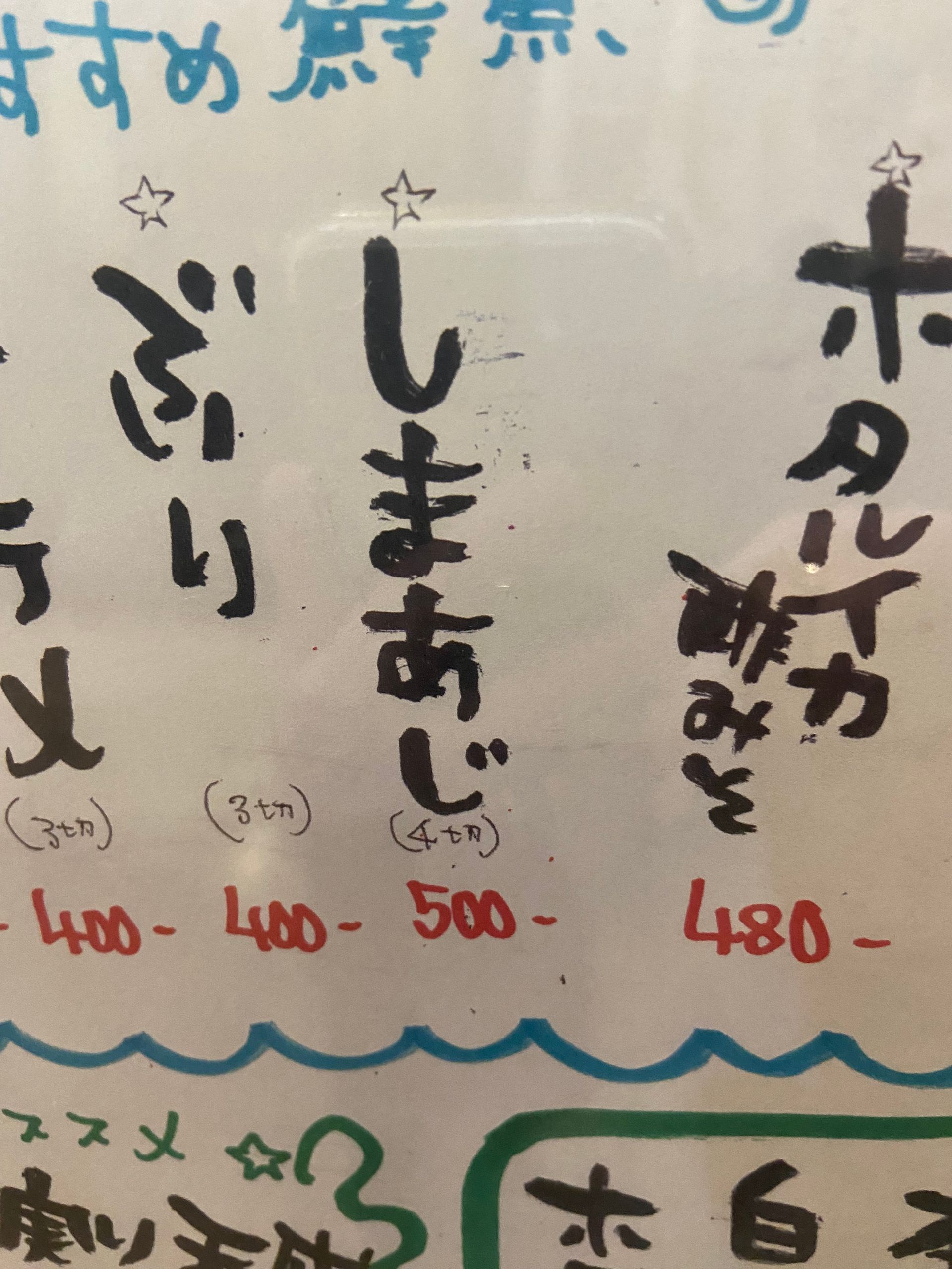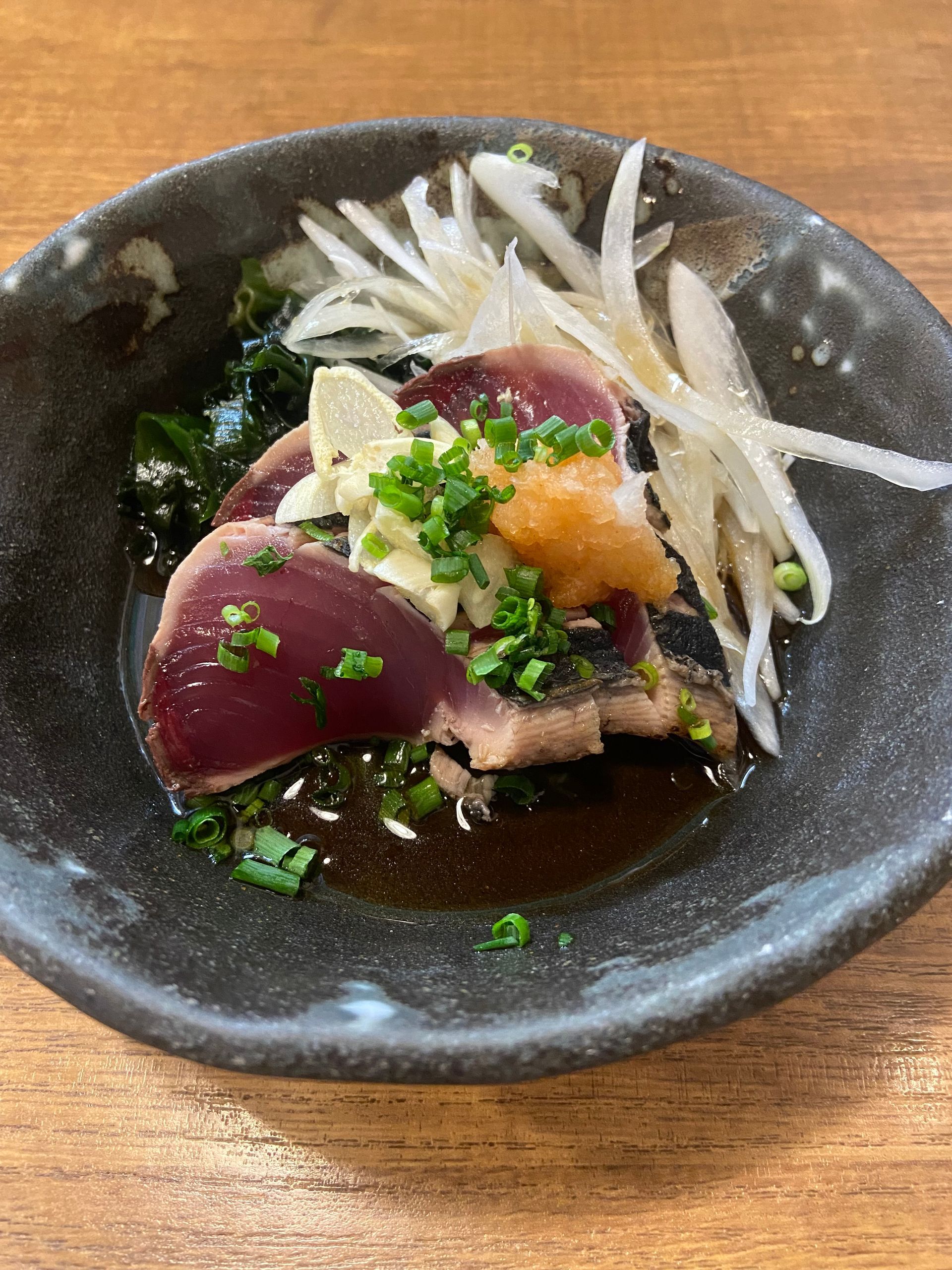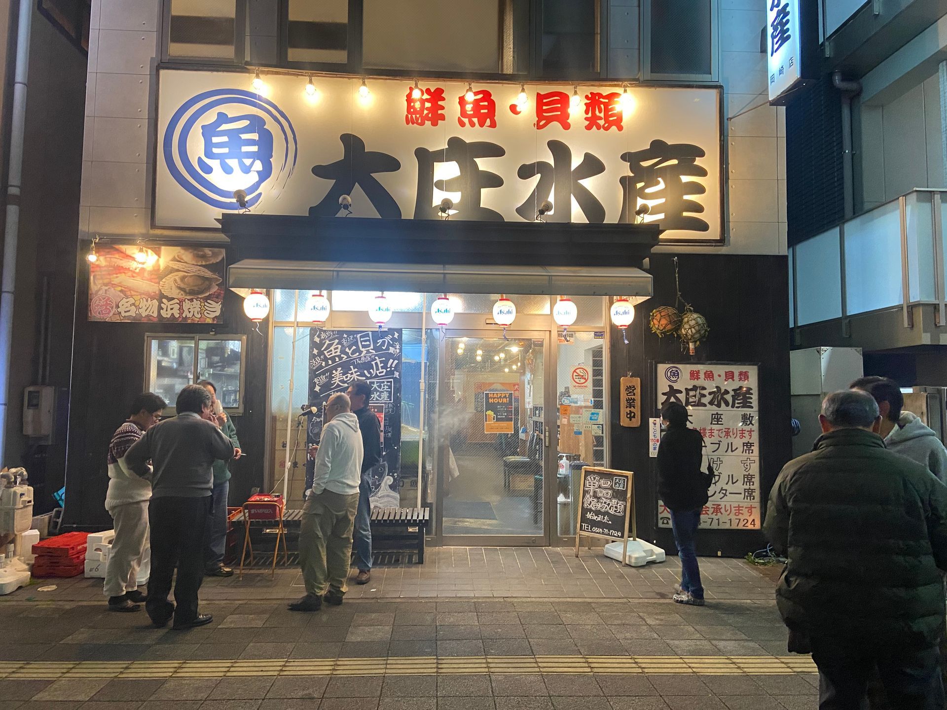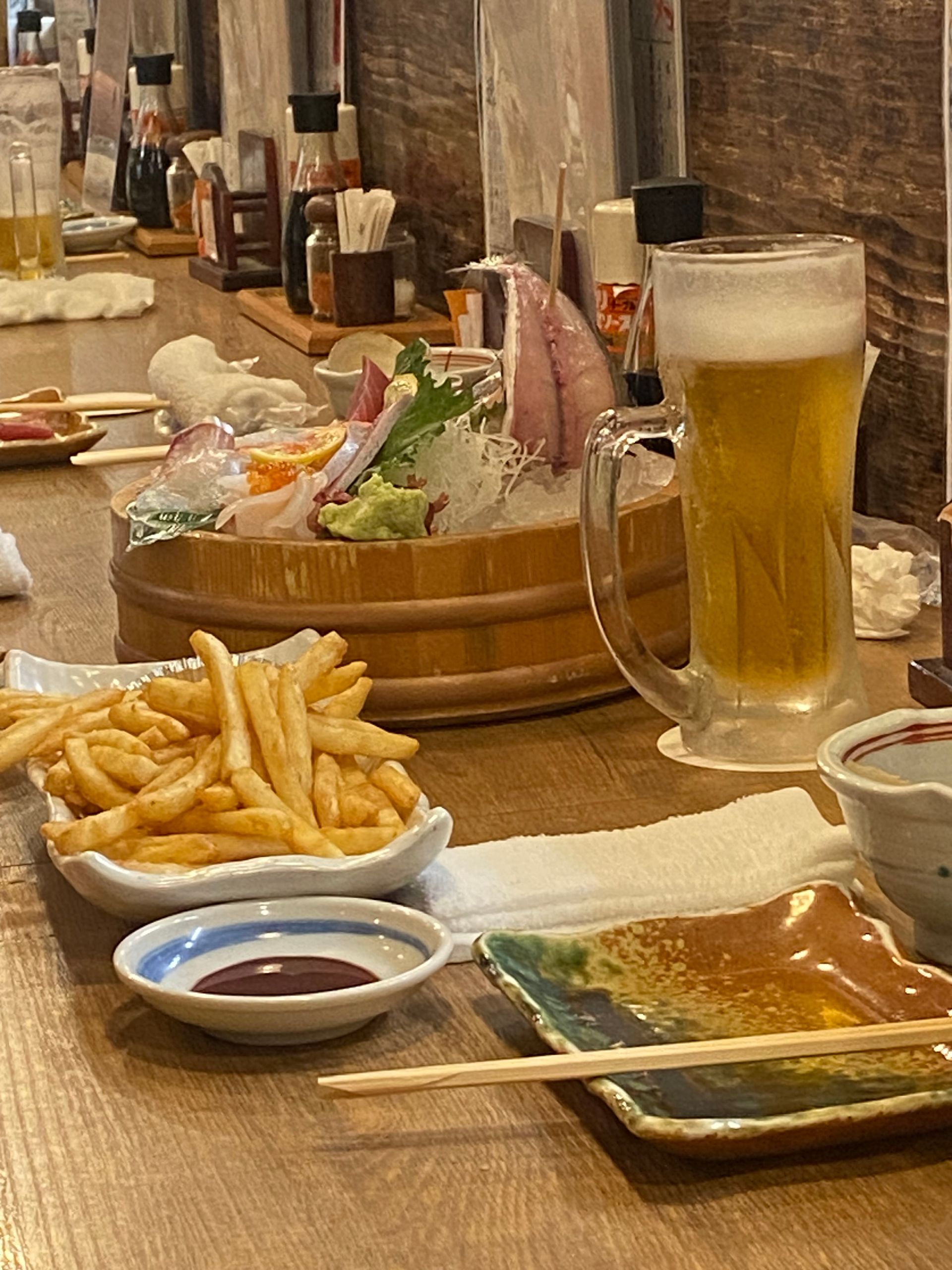 Natuurlijk ’s avonds aan de counter gegeten bij Daisho Suisan. Een bijzonder lekkere tataki van bonito en o.a. sashimi van shimaaji, familie van de horsemakreel maar dan niet vet en vissig zoals makreel kan zijn, maar eerder zacht en romig. Lijkt een beetje op kampachi (geelstaart/amberjack). Dan zie ik naast me ook weer iets dat voor mij als bijzonder voelt. Echt oost ontmoet west. Een enorme bak sashimi met een halve vis die eruit steekt, bier en patat. Met weemoed nam ik bij het afscheid een avondfoto van een van die plekken waar ik zo moeilijk afscheid van kan nemen.