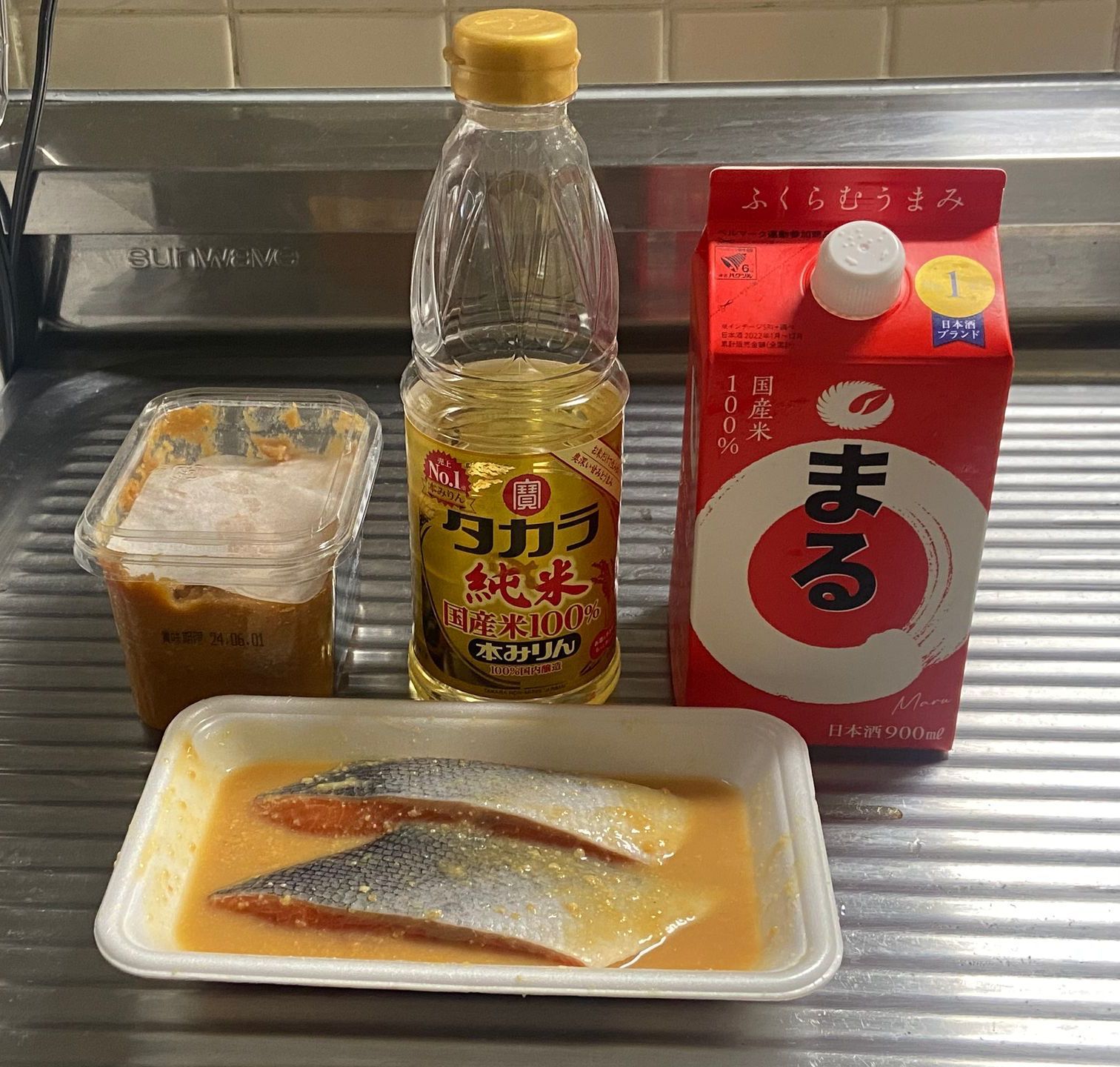 Was de vis, controleer op graten en dep droog. Afhankelijk van de hoeveel vis die je wilt bereiden maak je de marinade. Voor die twee kleine mootjes gebruikte ik ongeveer 50 gram miso. Daarbij ging een scheut gewone sake (op de foto het rode pak) en een scheut honmirin, van elk ongeveer 30 gram. Meng het goed. Smeer de filets er aan alle kanten mee in. Leg ze met de vleeskant van de vis naar beneden in de marinade. Ik had geen behoorlijke schaal of zo en gebruikte het bakje waarin ik de vis had gekocht dat ik goed had afgewassen met een plastic zakje er omheen. Dek af en zet in de koelkast. Een uur maakt het al lekker, twee uur nog lekkerder. In die tijd kun je rijst en groenten (voor)bereiden. Of zoals ik een salade, die ik op het laatste moment aanmaakte met sesamdressing. Een half uur voor je de vis wilt gaan bakken, haal je hem uit de koelkast. Voor het bakken de marinade eraf afdeppen. Er mag een beetje blijven zitten. Verhit wat neutrale olie in een koekenpan en bak de vis eerst op de velkant en daarna op de andere kant net gaar. Trek, indien gewenst, het vel eraf. Dien op jouw favoriete manier op en geniet.