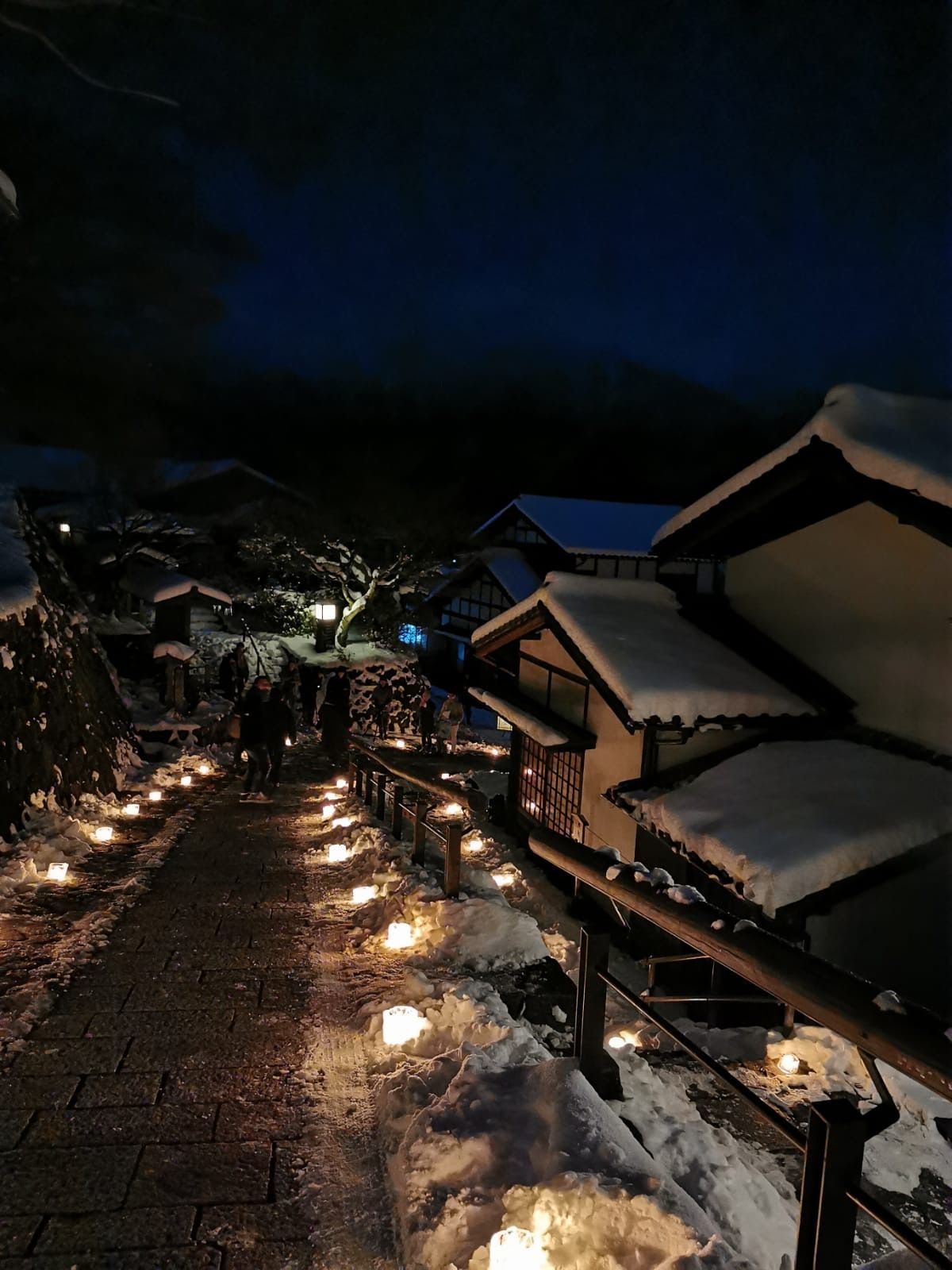 Mijn klasgenoot is het weekend in Magome. Heeft daar een stuk van de oude postroute gelopen. Wij, mijn partner en ik, hebben dat in een ander jaargetijde in 2019 gedaan. Toen was het al prachtig. Nu geeft het sprookjesachtige beelden. Ik mocht haar foto's gebruiken. Zeker tijdens het kaarsenfestival, wanneer langs de hoofdstraat van het dorp allemaal kaarsen in potjes staan opgesteld, ziet het er geweldig uit.