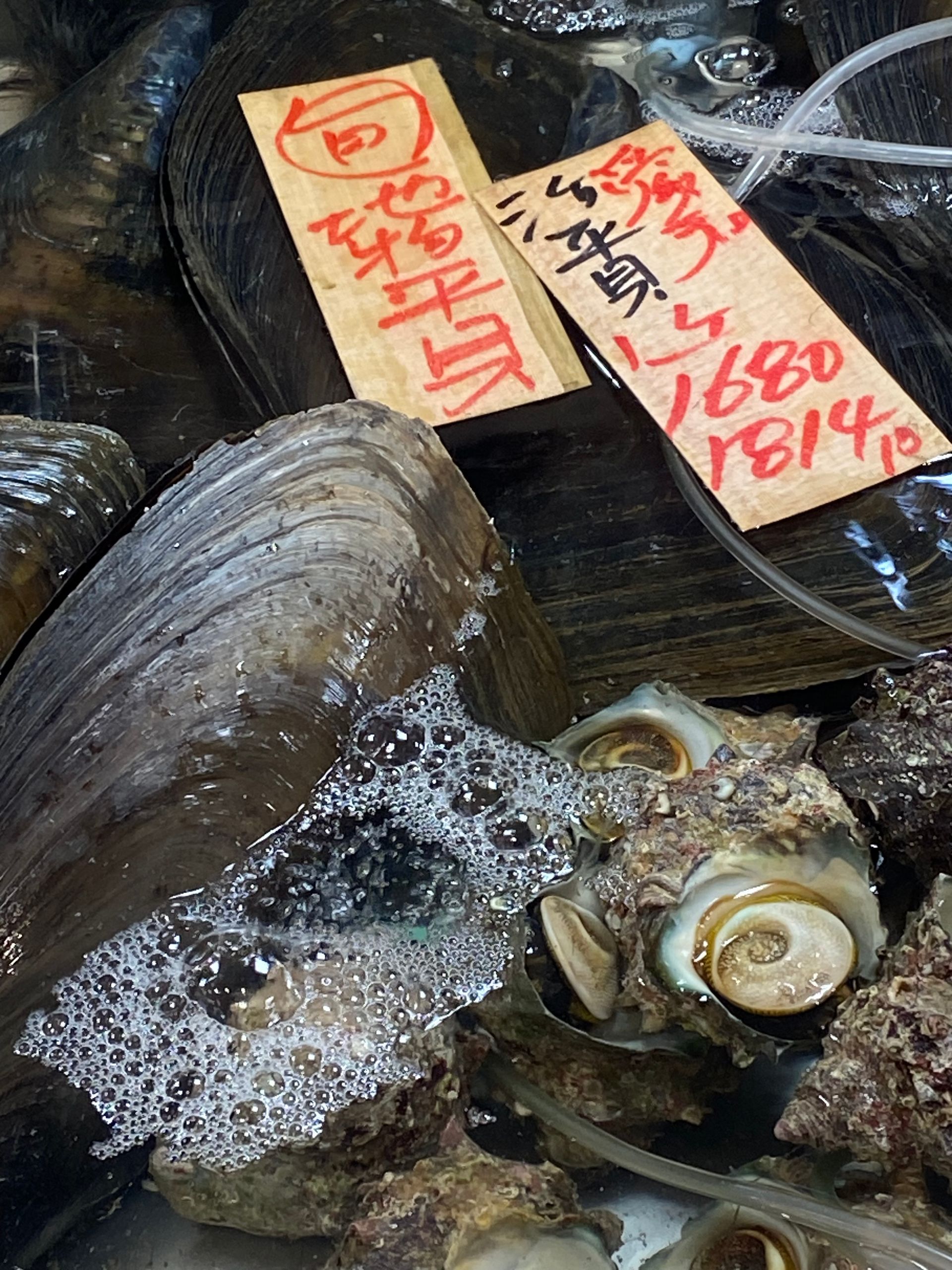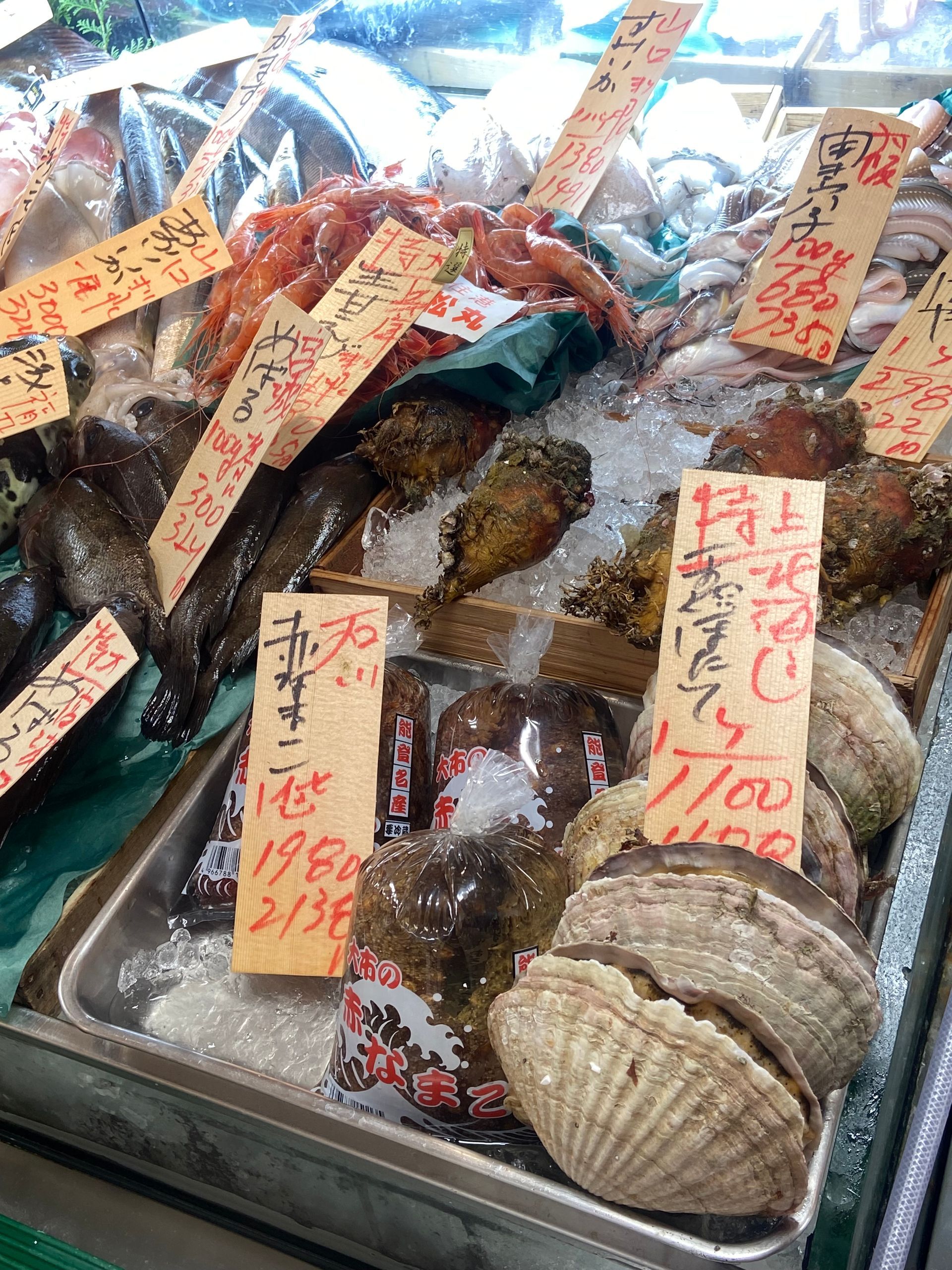 Bij Mitsukoshi op de delicatessenafdeling vergaapten we ons aan het aanbod van verse voor ons niet echt bekende schaal en schelpdieren. Ook aan de prachtige manier waarop taart, groente en fruit wordt geëtaleerd. We kochten twee enorme dekopon, ongeveer nog groter dan een uit de kluiten gewassen grapefruit.