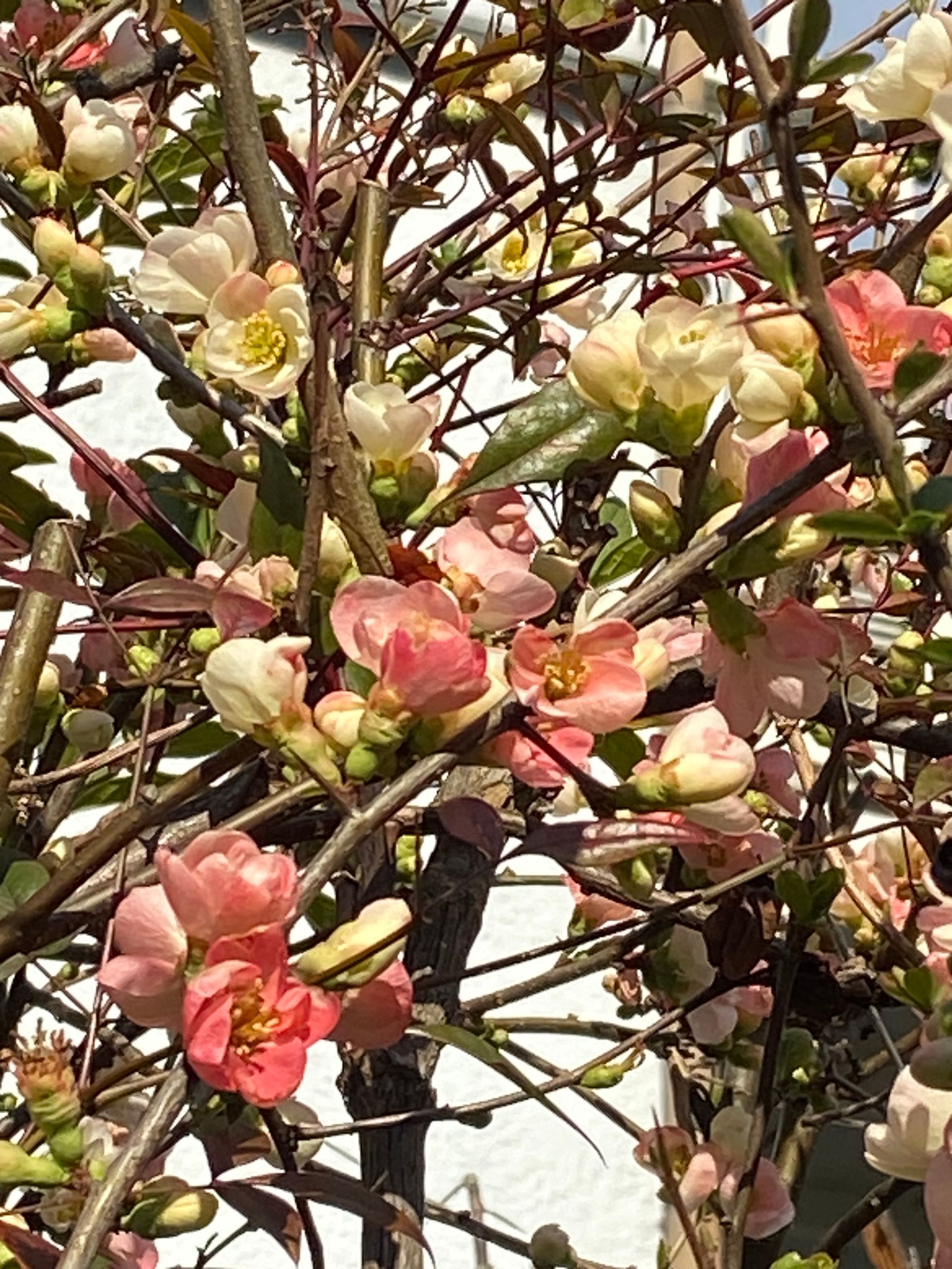 De lente lijkt eindelijk begonnen. Zo her en der verrijzen bij de huizen allerlei potjes met violen en andere kleine fleurige potplanten.