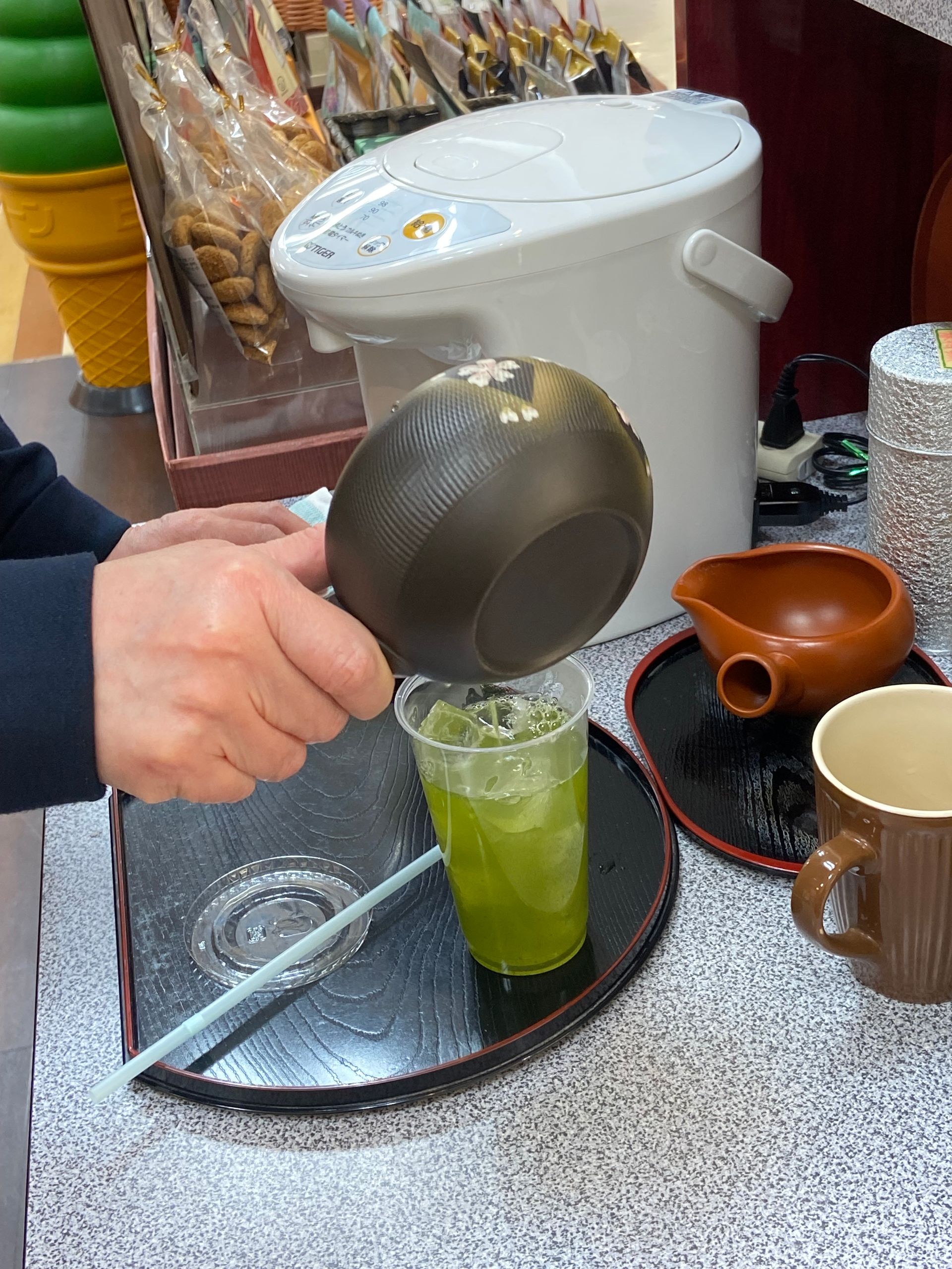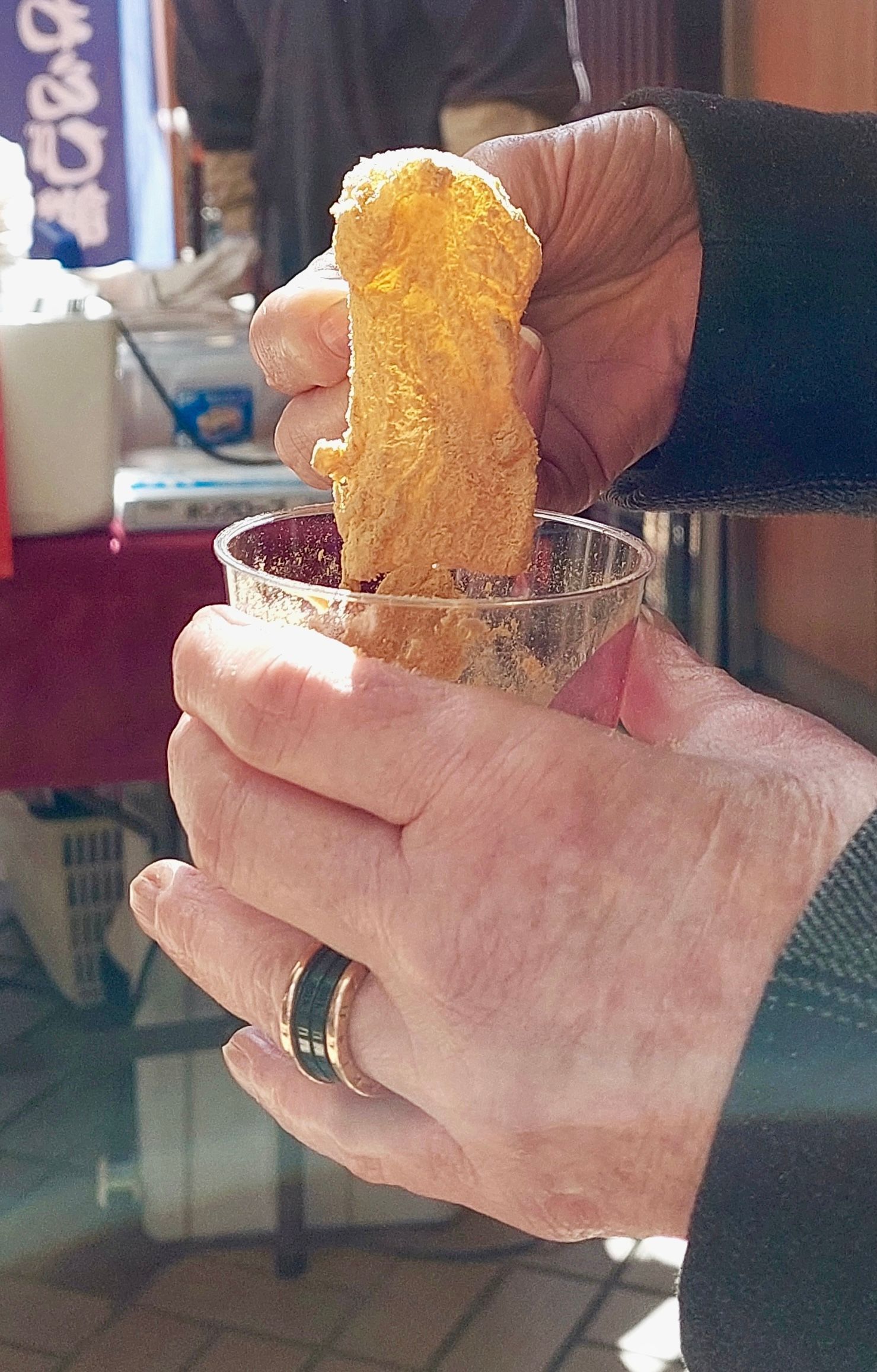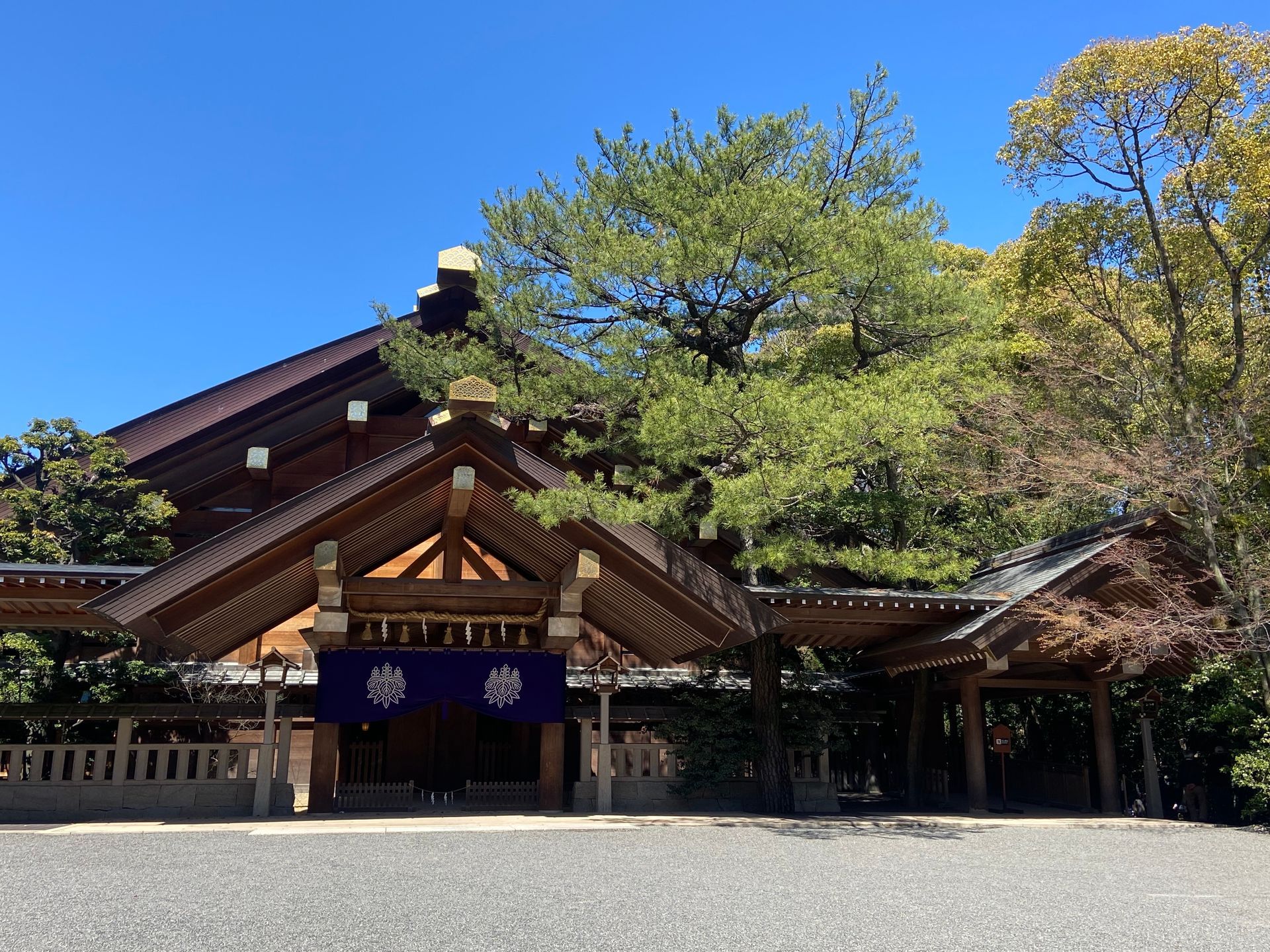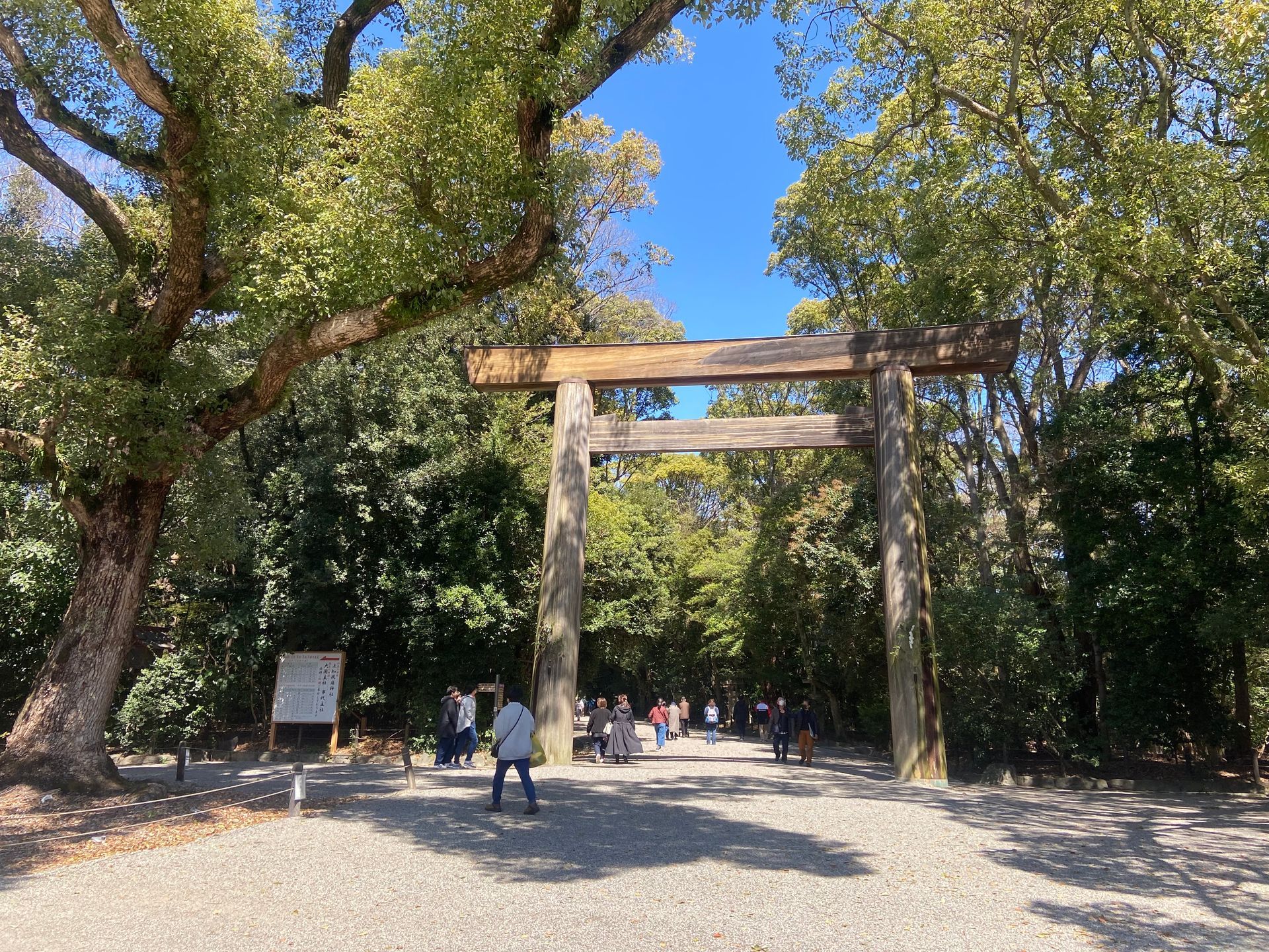Mijn volgende stop was Atsuta Jingu Shrine in Nagoya. Daar wilde ik nog een keer heen. Bij een vijver stond een dame in traditionele kleding van de vijver te genieten onder een van de weinige bloeiende bomen. Op het terras van de cafetaria bemachtigde ik een plek. Al snel raakte in gesprek met een dame en haar zoon die bij mij aan tafel kwamen zitten. Dat vind ik echt leuk aan het alleen dingen doen in Japan. Je raakt vaak in gesprek wat een leuke conversatie oefening is, die zelden opdringerig is of irritant, en voor mij precies de juiste afstand behoudt, waarna je vriendelijke afscheid kunt nemen. Natuurlijk at ik kishimen, de specialiteit van Nagoya. Zachte, platte tagliatelle-achtige noedels die in bouillon worden geserveerd. Ik had er ook nog een soort gefrituurde koek van groenten bij die op een portie rijst met nori lag. Wij zullen niet snel noedels en rijst samen serveren, maar in Japan is dat heel gewoon. En die rijst, zo heerlijk, met bite, tegelijk zacht en romig, die net genoeg aan elkaar blijft plakken om met stokjes te kunnen eten.
