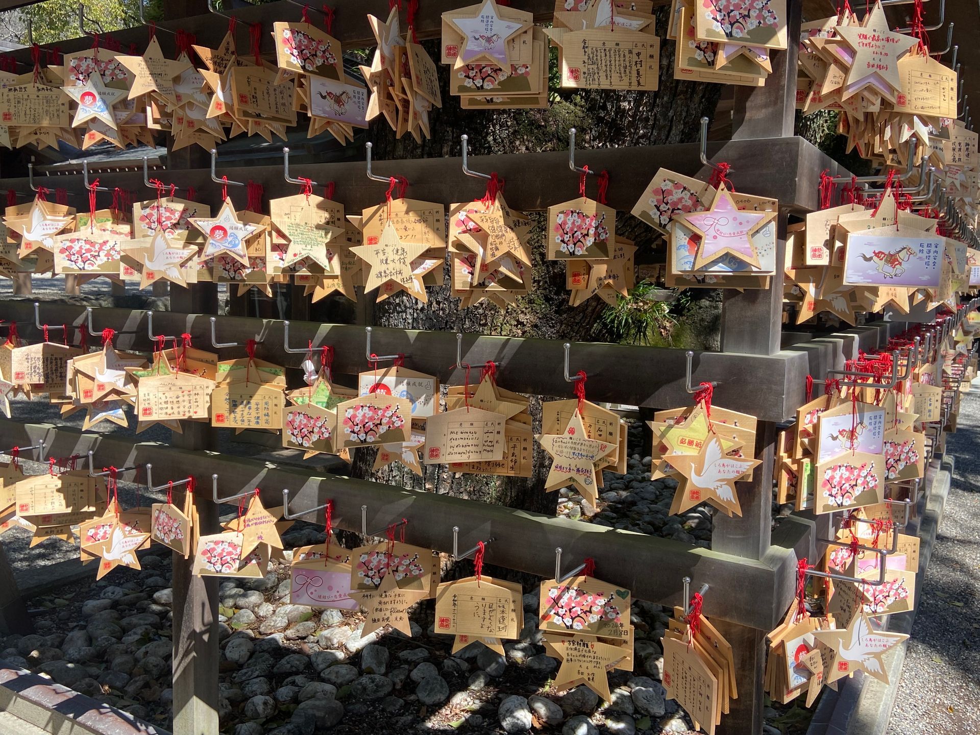 Er staan ook een aantal enorme kamferbomen waarvan wordt gezegd dat sommige meer dan 1000 jaar oud zijn. Kamferbomen hebben in het Japanse shinto geloof allerlei betekenissen, onder andere dat het bescherming biedt. Om die enorme bomen zit vaak een ‘shimenawa’ een touw van stro met witte strips papier. Het laat zien dat het een heilige plek is. Soms vind je ‘shimenawa’ ook om heilige stenen, entréepoorten tot heiligdommen etc. etc.