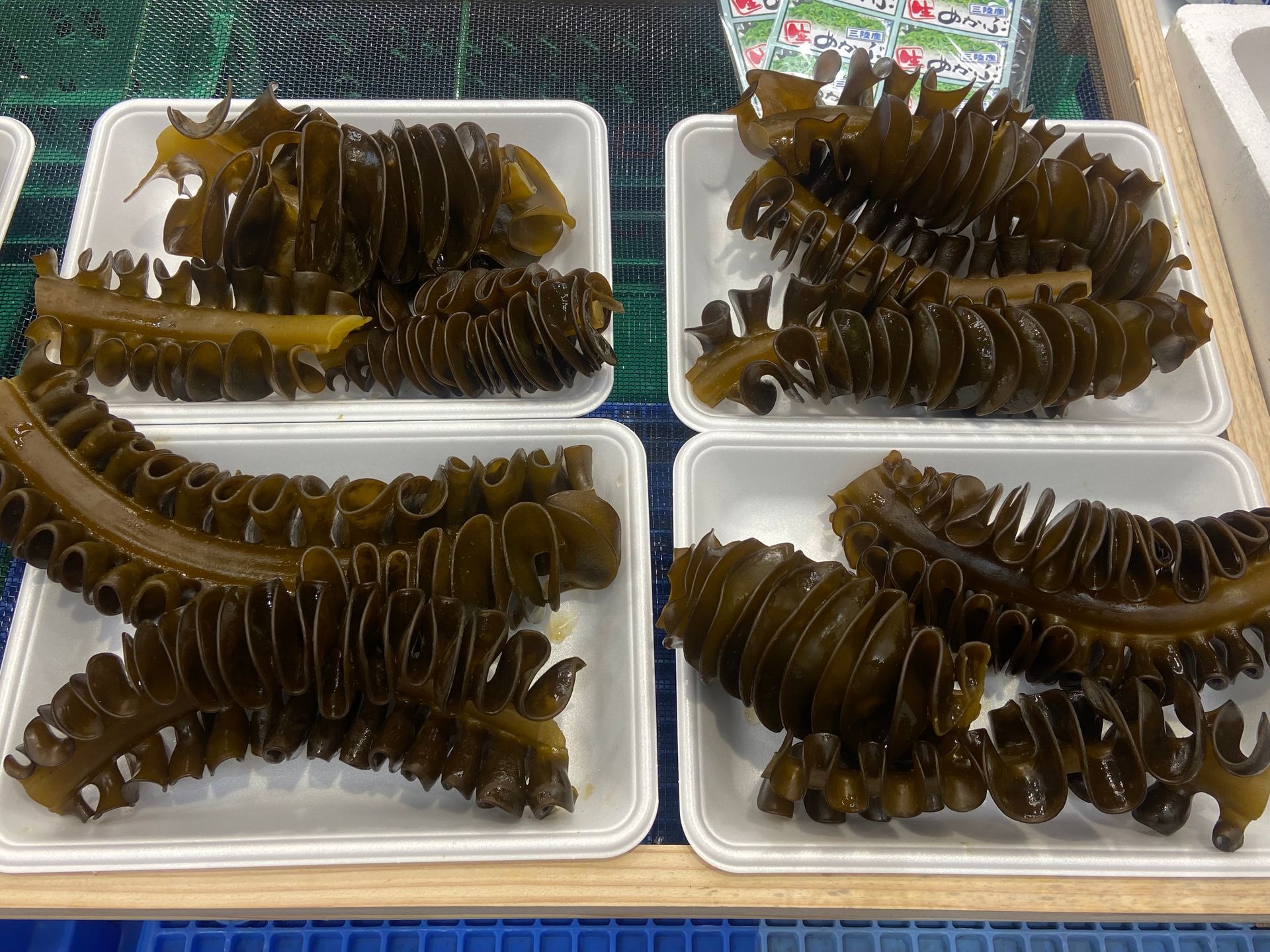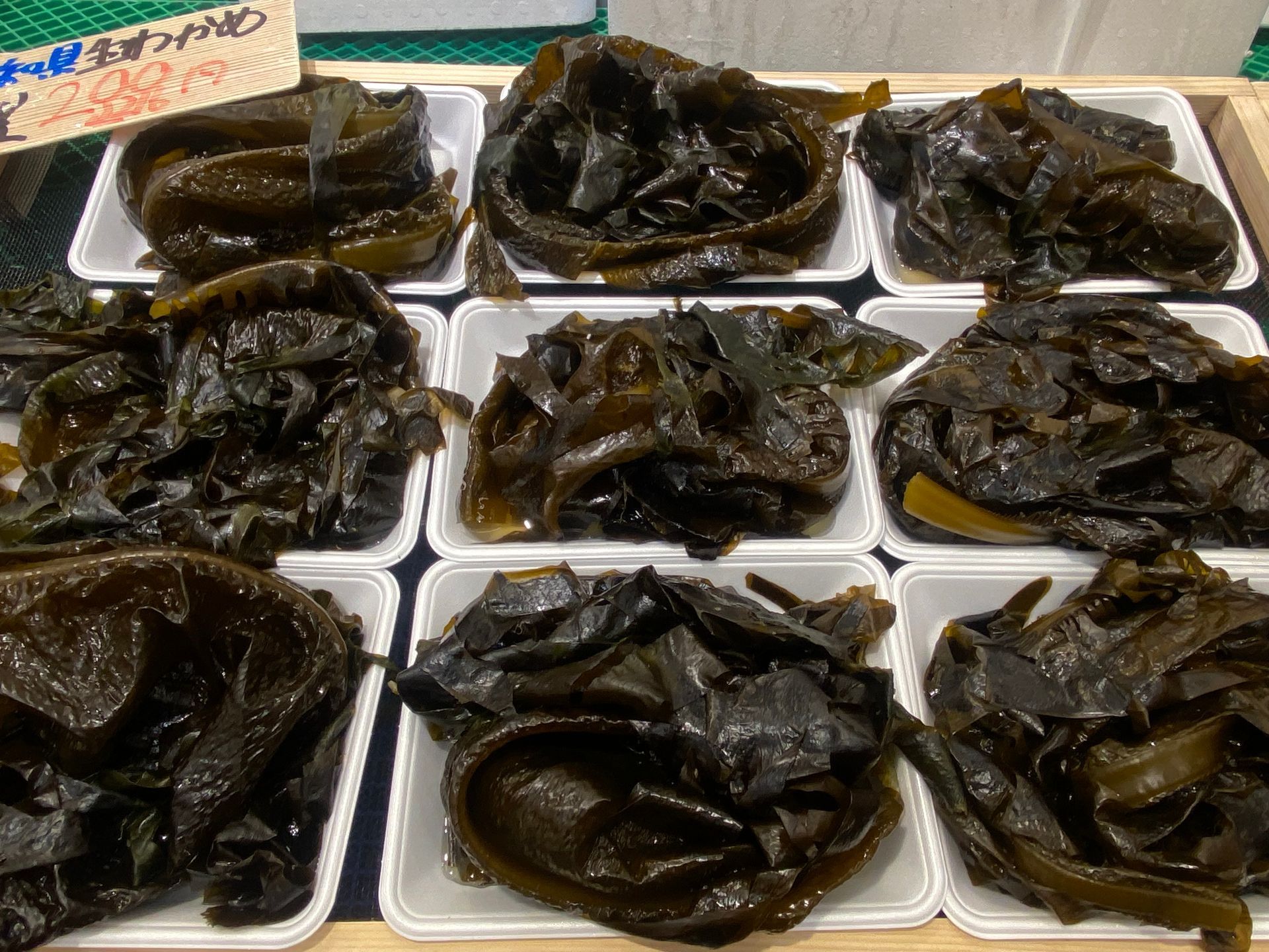 Er lag verse zeewier bij de supermarkt. Die met die krullen ruikt echt super naar zee. Verse wakame, op de bovenste foto, spoel je eerst af, dan snijd je de dikke nerven eruit en kook je het kort, waarna het zijn felgroene kleur krijgt. Je kunt wakame onder andere gebruiken in salades of met wat dun gesneden rauwe vis (of tataki van bonito) en ponzu saus.