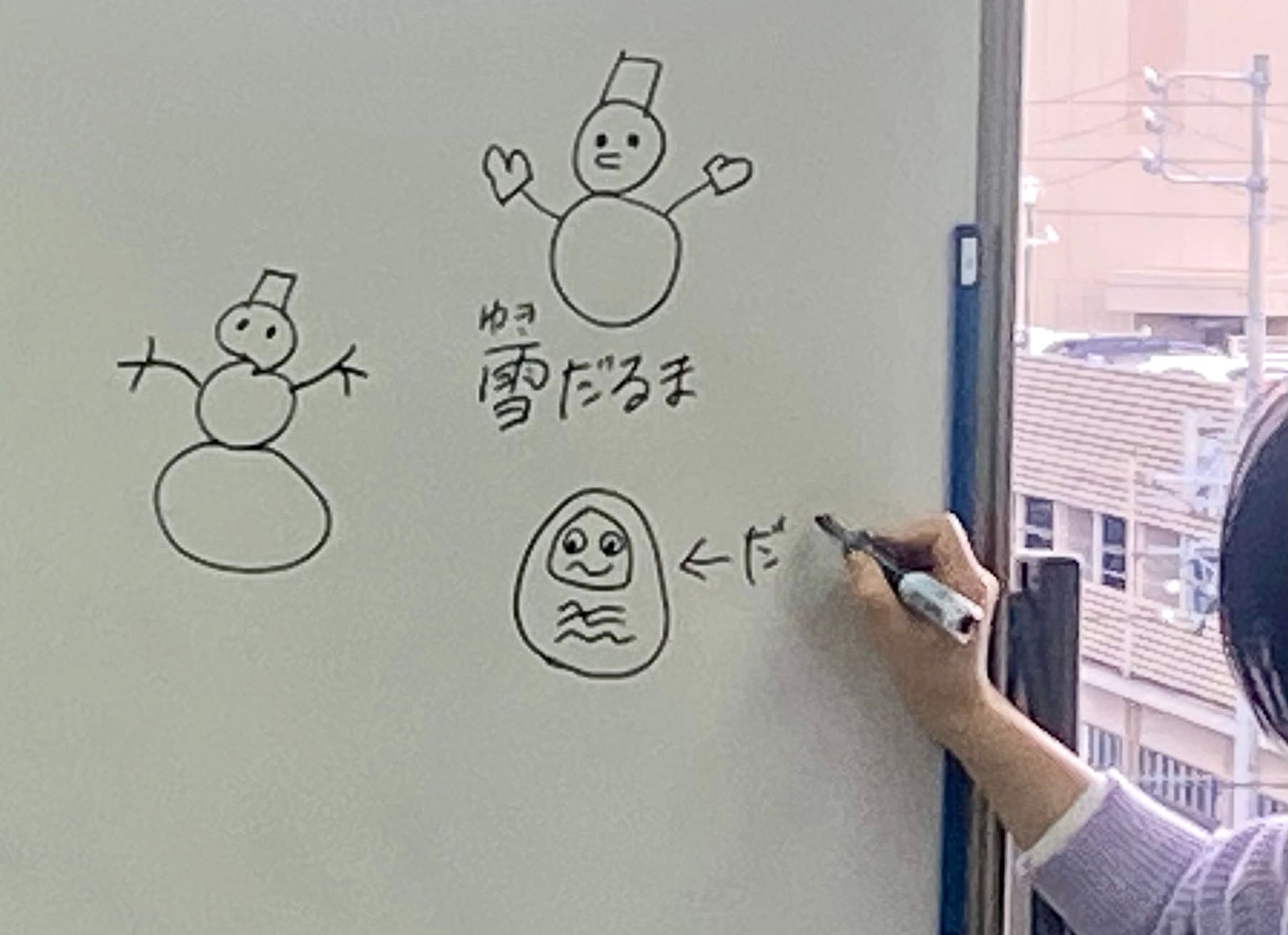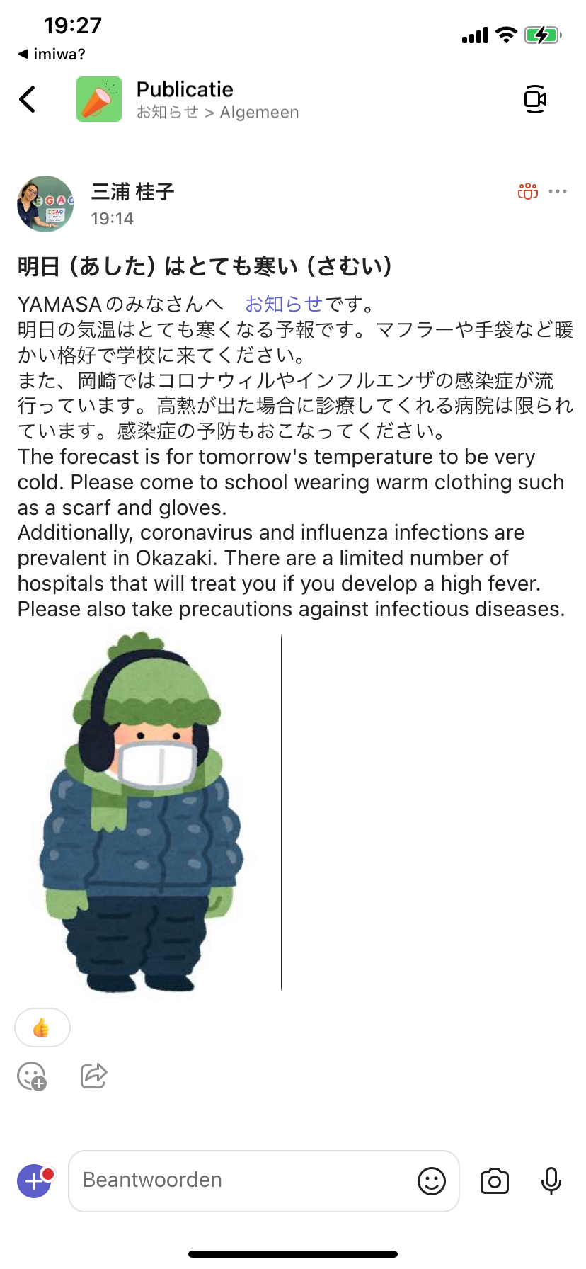 Gisteren hadden we via Teams van school een bericht gekregen over kou en griep en corona. En ja hoor. Ik deed de deur open en er lag een minuscuul laagje sneeuw. Een paar klasgenoten waren zeer opgewonden, omdat zij dit voor het eerst zagen. De sensei tekende yukidaruma, een Japanse sneeuwpop op het bord. Een daruma is een soort duikelaartje met een gezicht erin. Daarom bestaat een Japanse sneeuwpop, legde ze uit, uit twee bollen en niet uit drie zoals bij ons. De sensei zong zelfs een paar regels van een sneeuwpoppenliedje. En dat allemaal voor een handjevol sneeuwvlokken. Gelukkig zien we ook al de kersenbloesemkalender verschijnen die voorspelt waar de kersenbloesem wanneer in bloei wordt verwacht te staan.