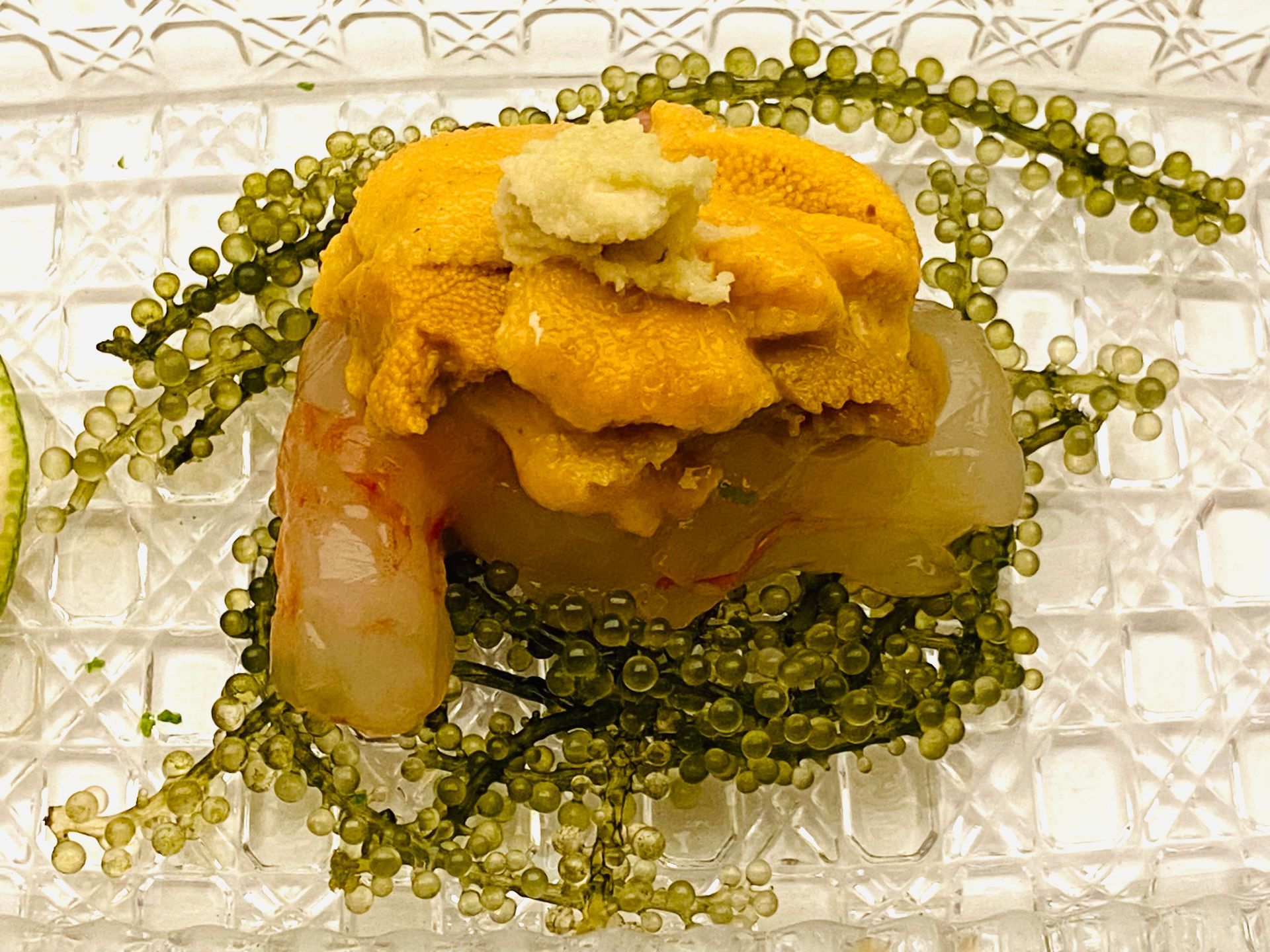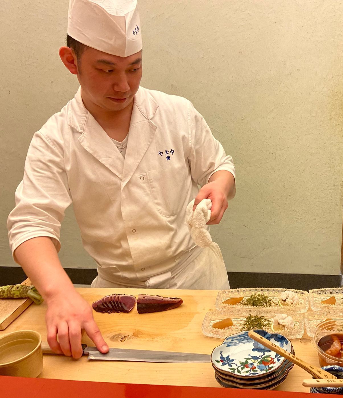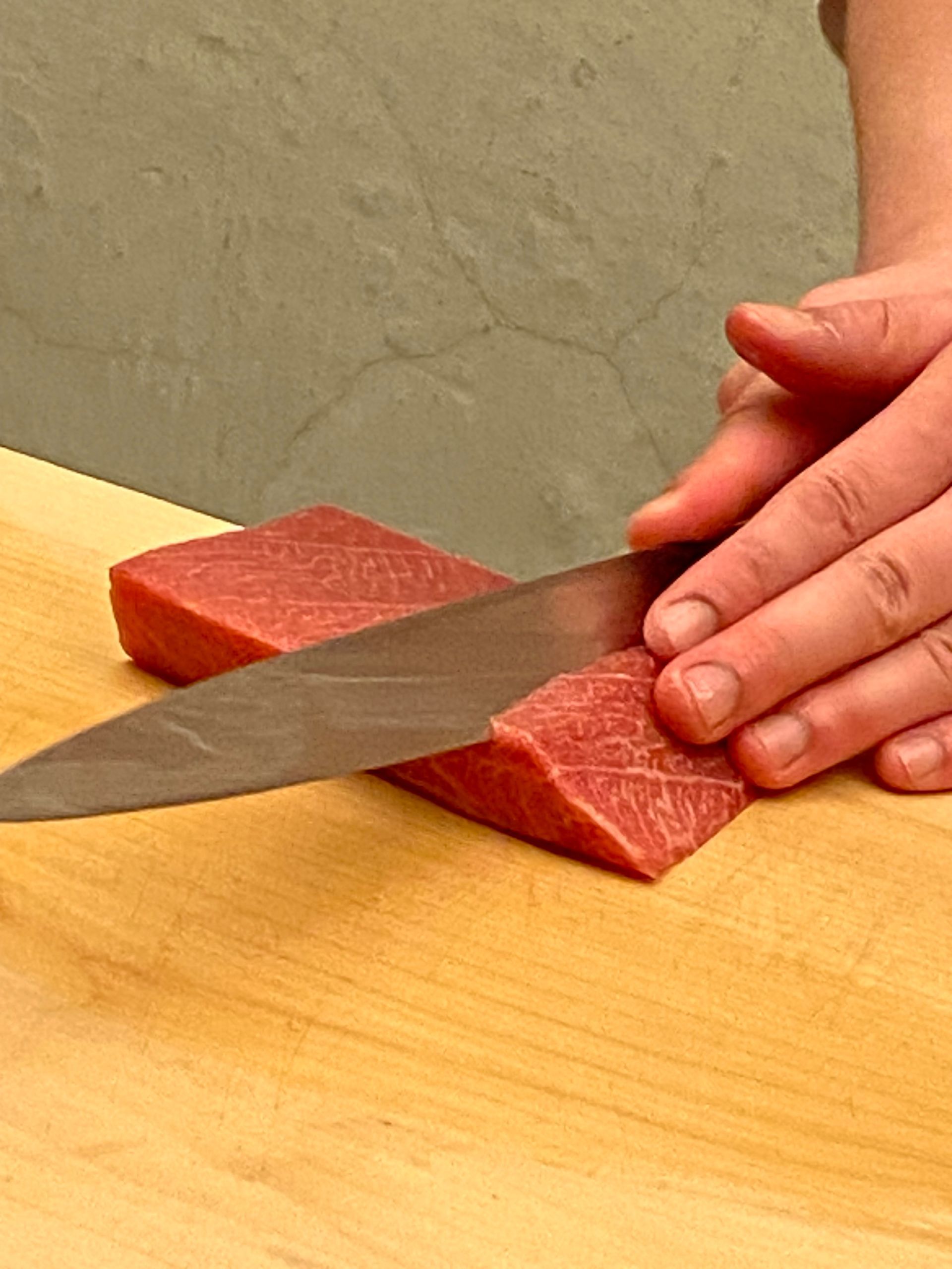 In een luxe sushi- en sashimi restaurant wordt door de chef elke sushi en elk gerecht vers voor je gesneden en bereid. In dit soort restaurants worden vaak luxere (seizoens)ingrediënten gebruikt zoals zee-egel, zeedruifjes, vers geraspte wasabi, een bijzondere rauw geserveerde grote garnaal, een mooi stuk toro van tonijn. Op de foto heeft de chef zojuist bonito gesneden voor verder gebruik.