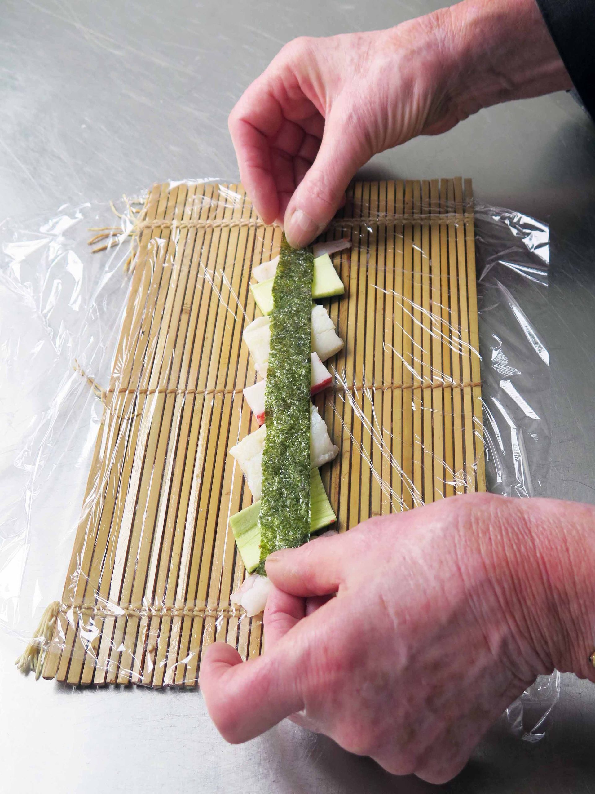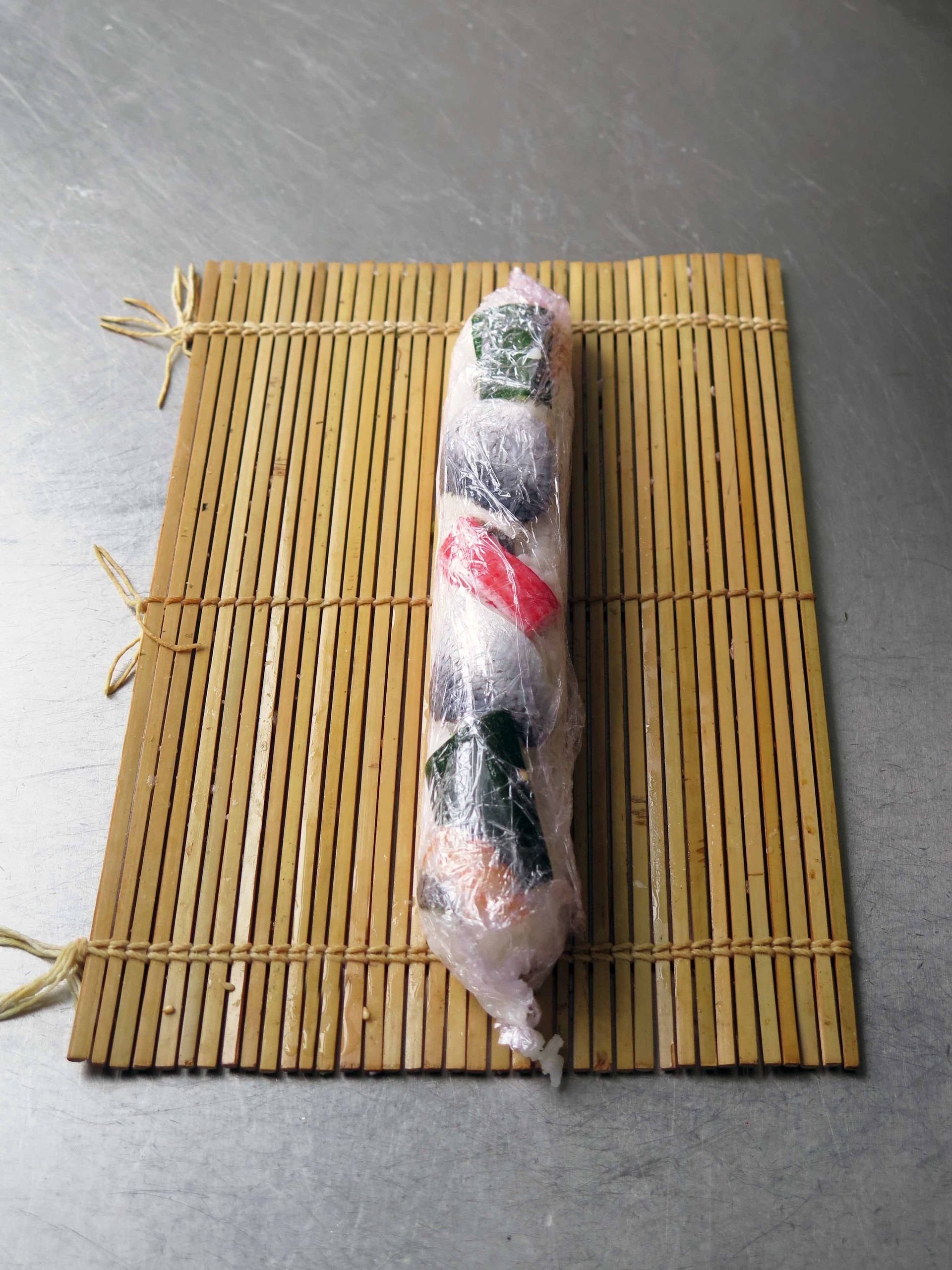 Leg er een reep nori op. Leg er de sushirijst op en druk zacht aan. Rol op en houd daarbij de vulling op zijn plaats. Trek de folie strak en draai de uiteinden dicht als een toffee. Laat een half uurtje liggen in het plasticfolie in de koelkast voor je het snijdt.
