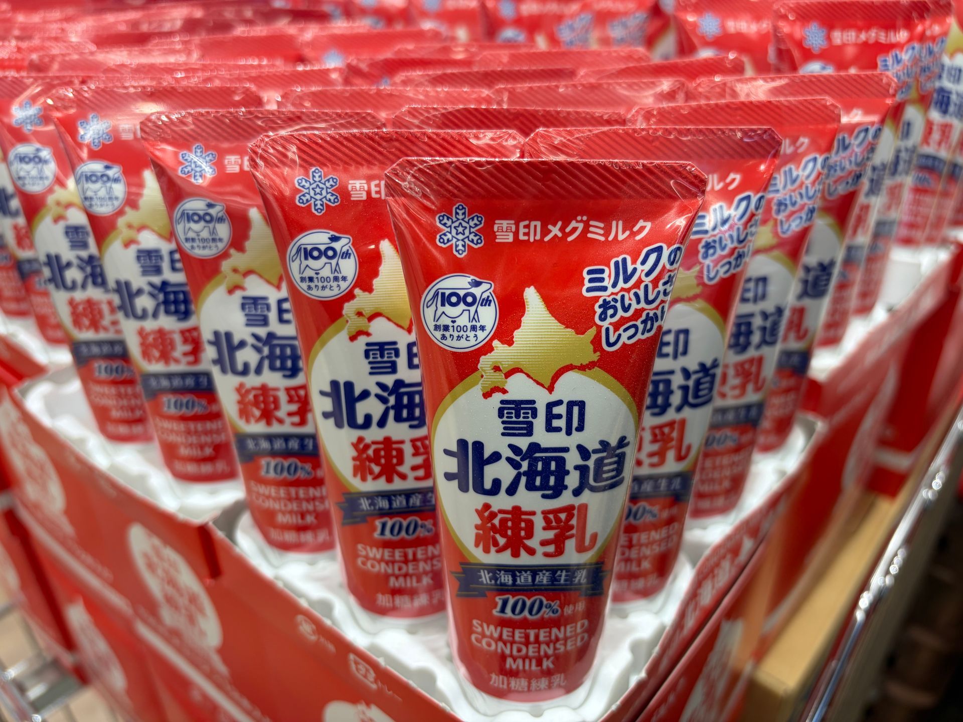 Tijdens het boodschappen doen, viel me weer op dat ze hier vooral in de aardbeientijd een alternatief hebben voor slagroom en wel gezoete gecondenseerde melk, maar dan in een tube, zodat je niet zo een geklieder hebt met een heel blik waar je meestal van overhoudt.