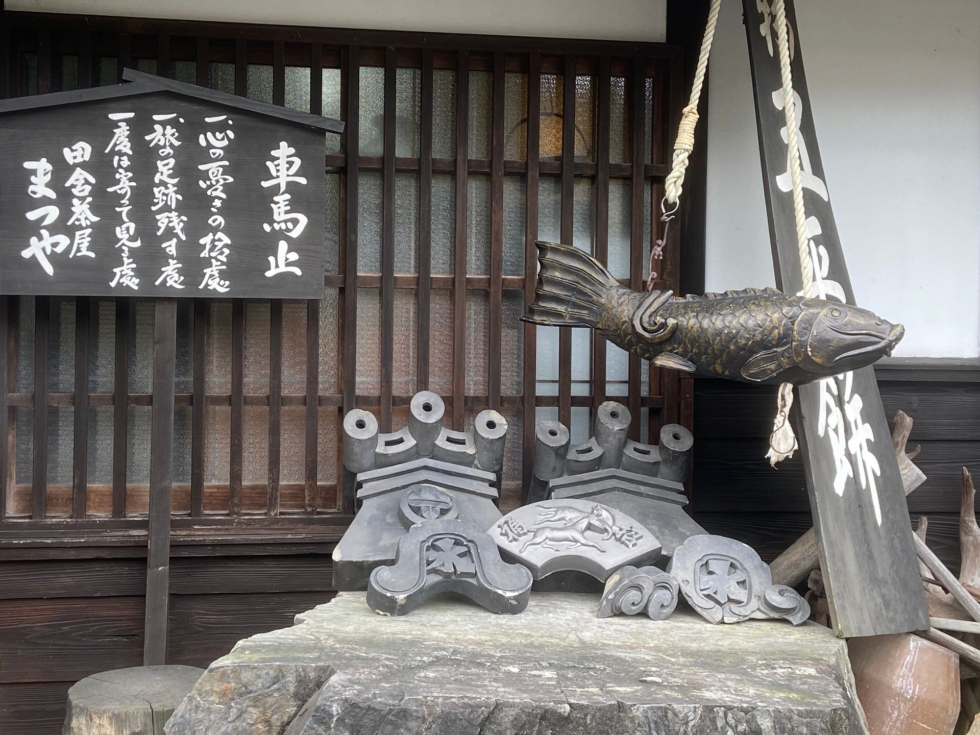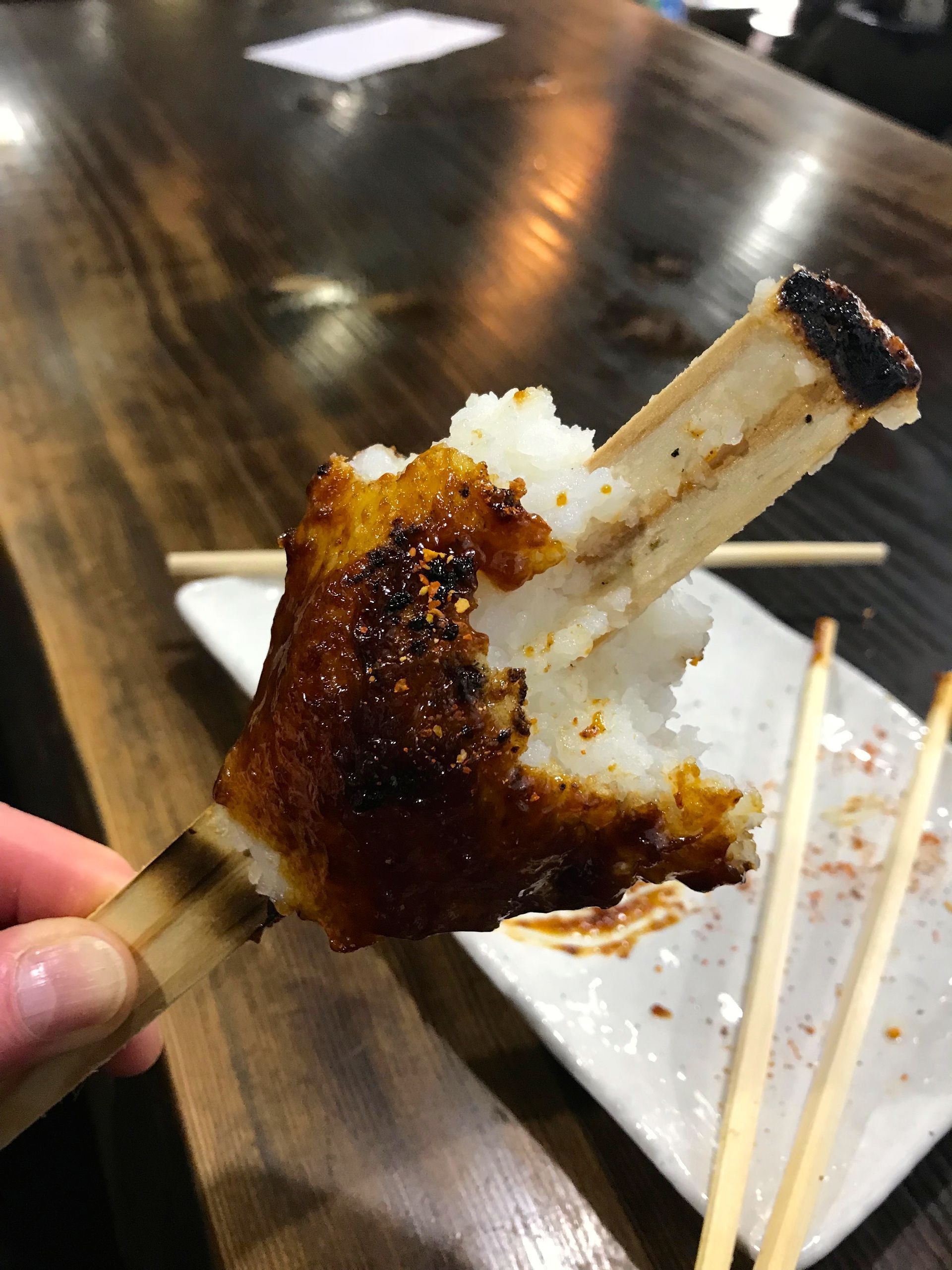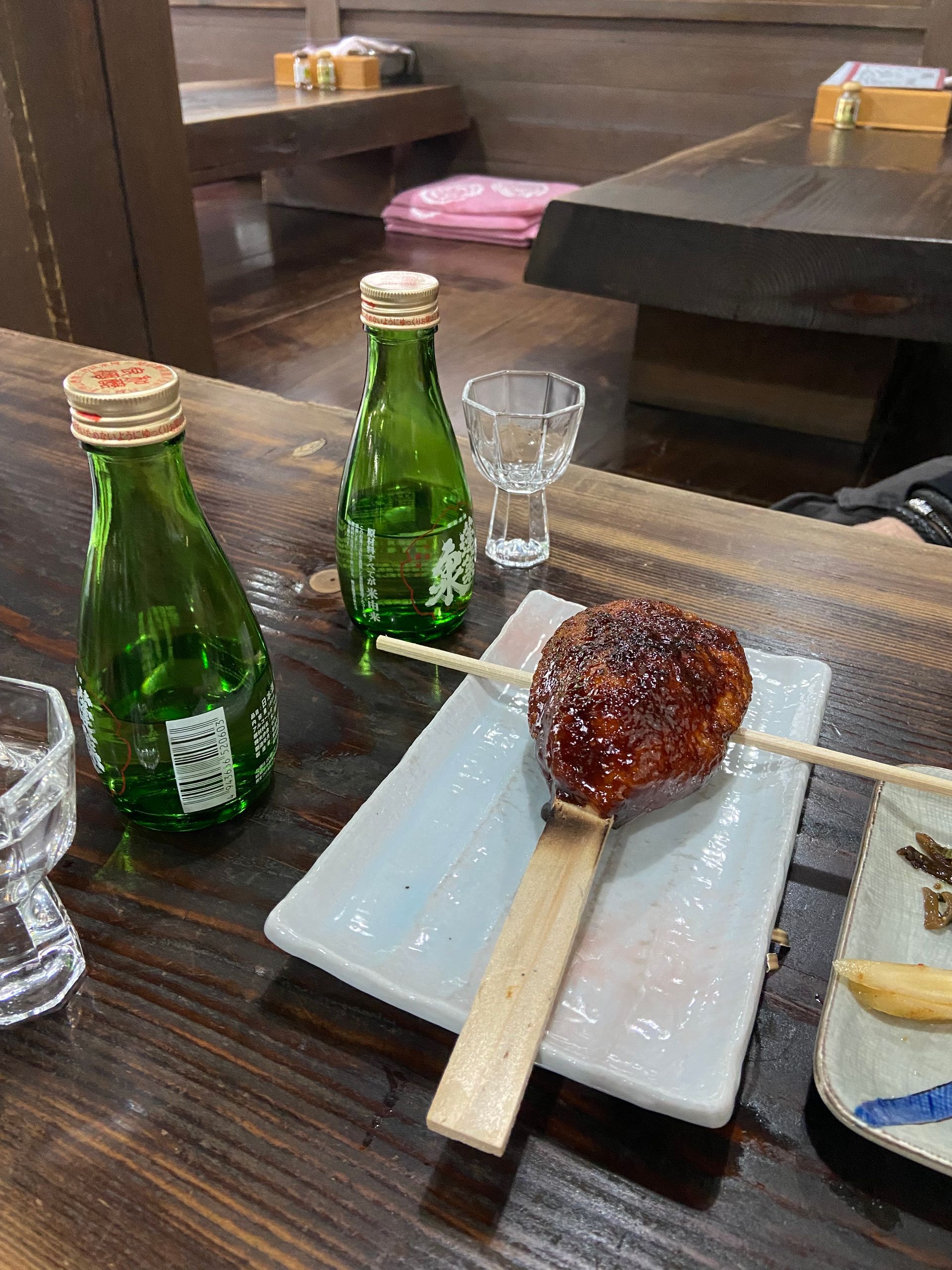 Voor we konden inchecken om 15.00 uur, maakten we een wandeling in de buurt en gebruikten we de lunch bij een traditioneel winkeltje waar je ook kunt eten. Onder andere hun specialiteit goheimochi. Dat is een soort cake van rijst die wordt geserveerd met een zoetige misosaus.