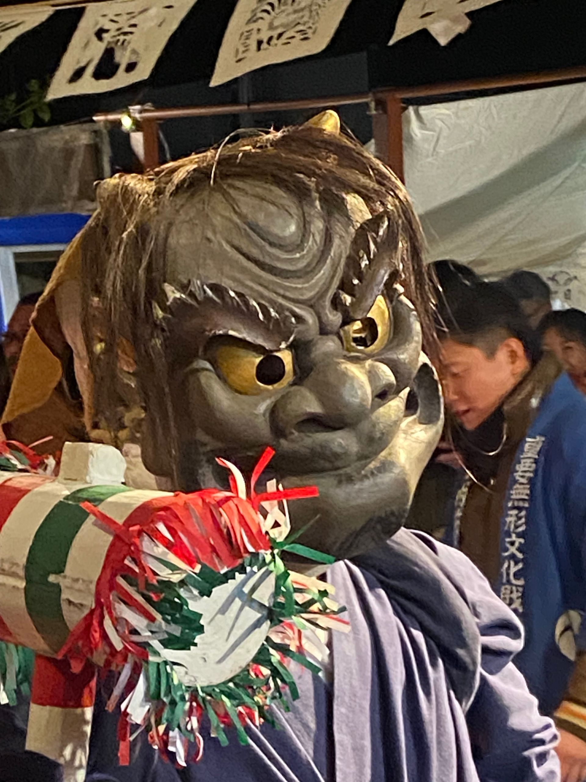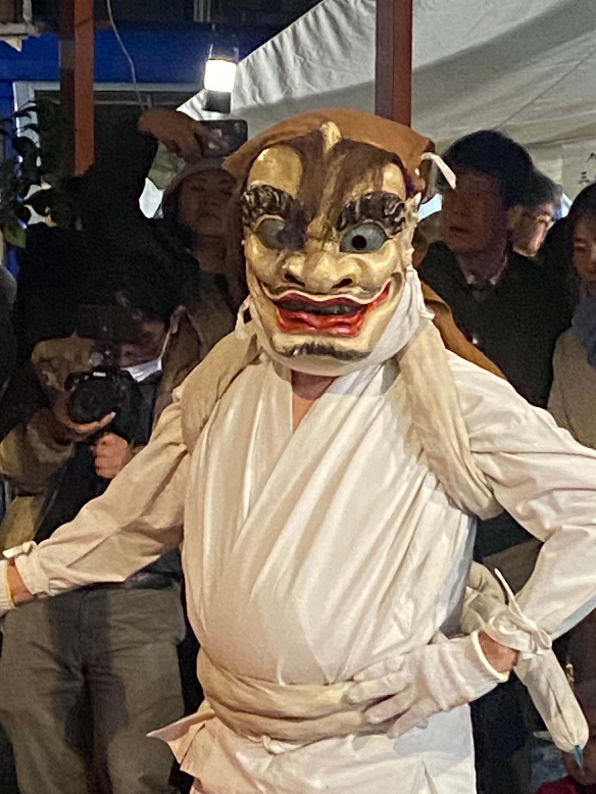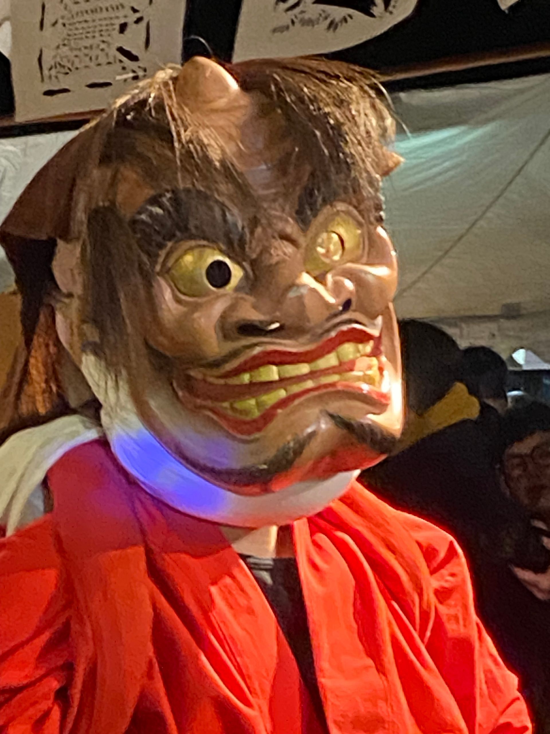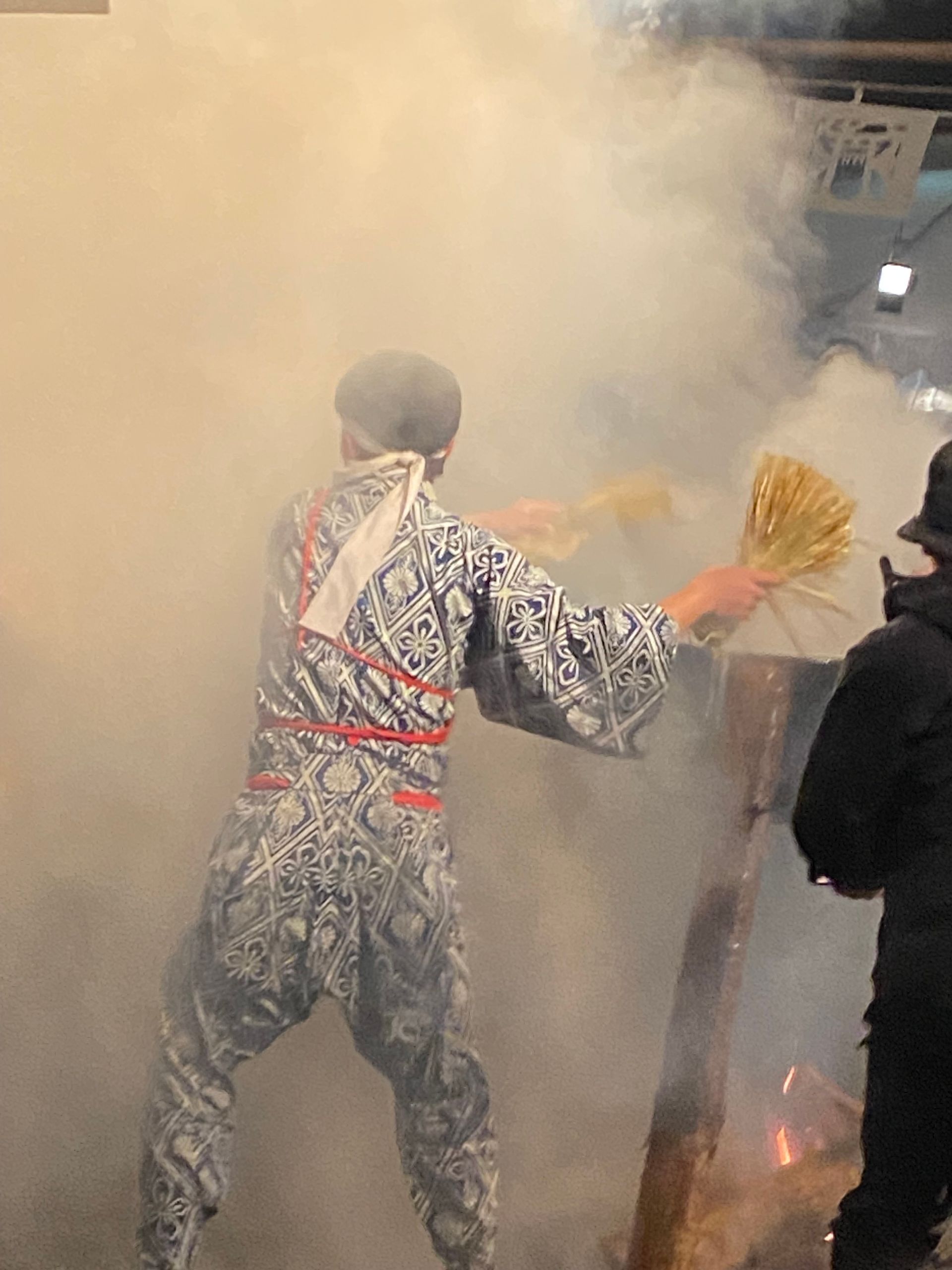 Na het diner konden we deelnemen aan Hana matsuri. Een van oorsprong 700 jaar oud feest dat in dit dorp in een soort verkorte versie elke zaterdag in februari wordt gevierd ergens buiten op een feestterrein. Je wordt verwelkomd met amazake, de warme zo goed als alcoholvrije rijstdrank met gember. Er wordt gedanst door vriendelijke ‘oni’ (duivels en demonen) samen met het publiek, waarbij men met takken groen door de lucht zwaait en ‘teehohe, tehohe’ roept, waarvan niemand weet wat het betekent.