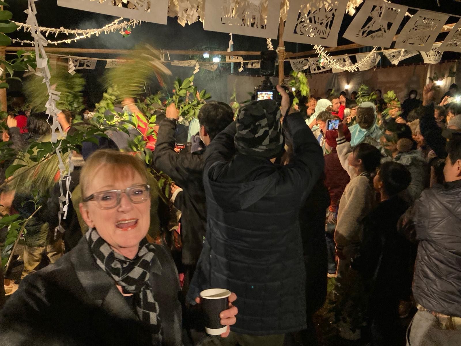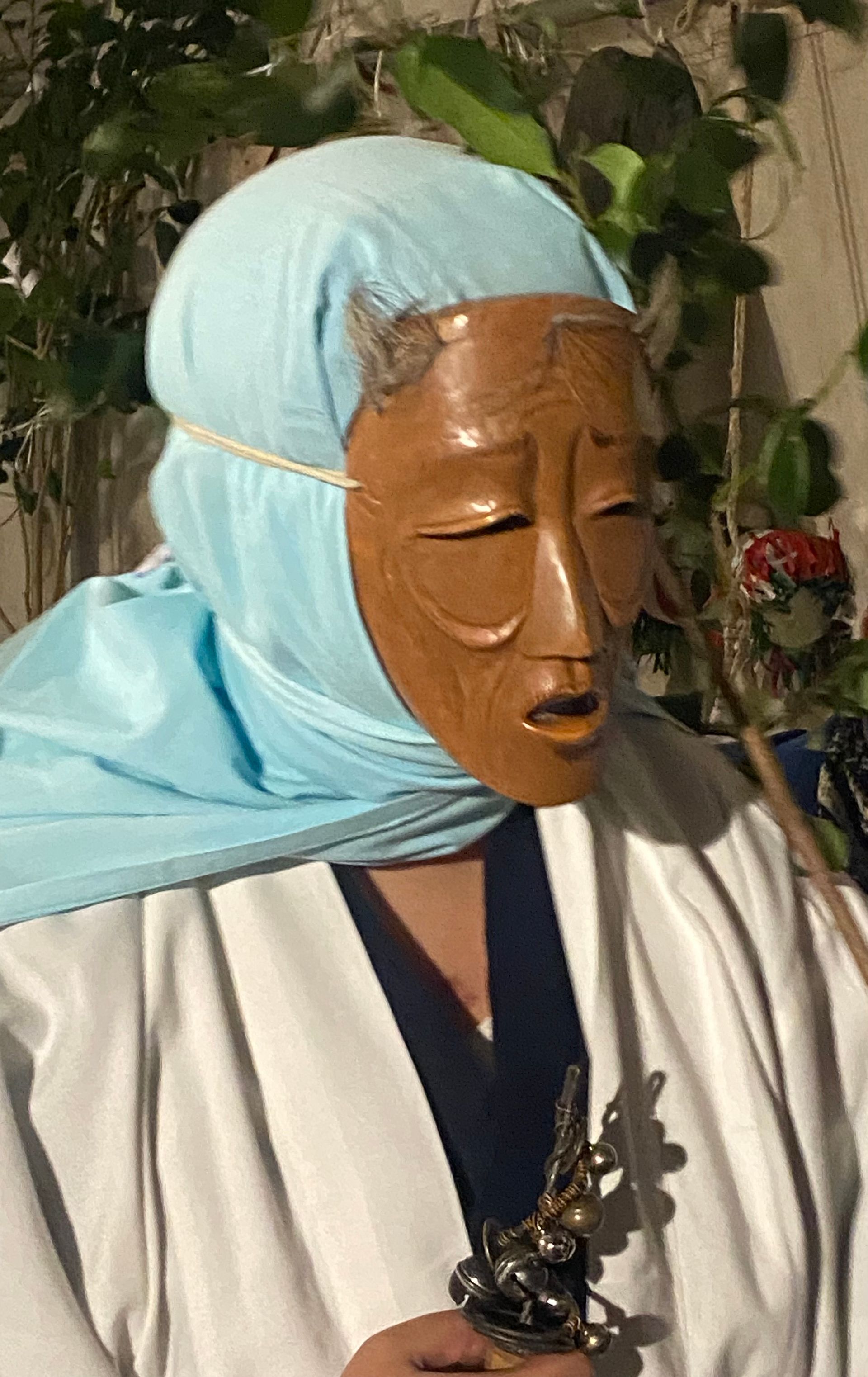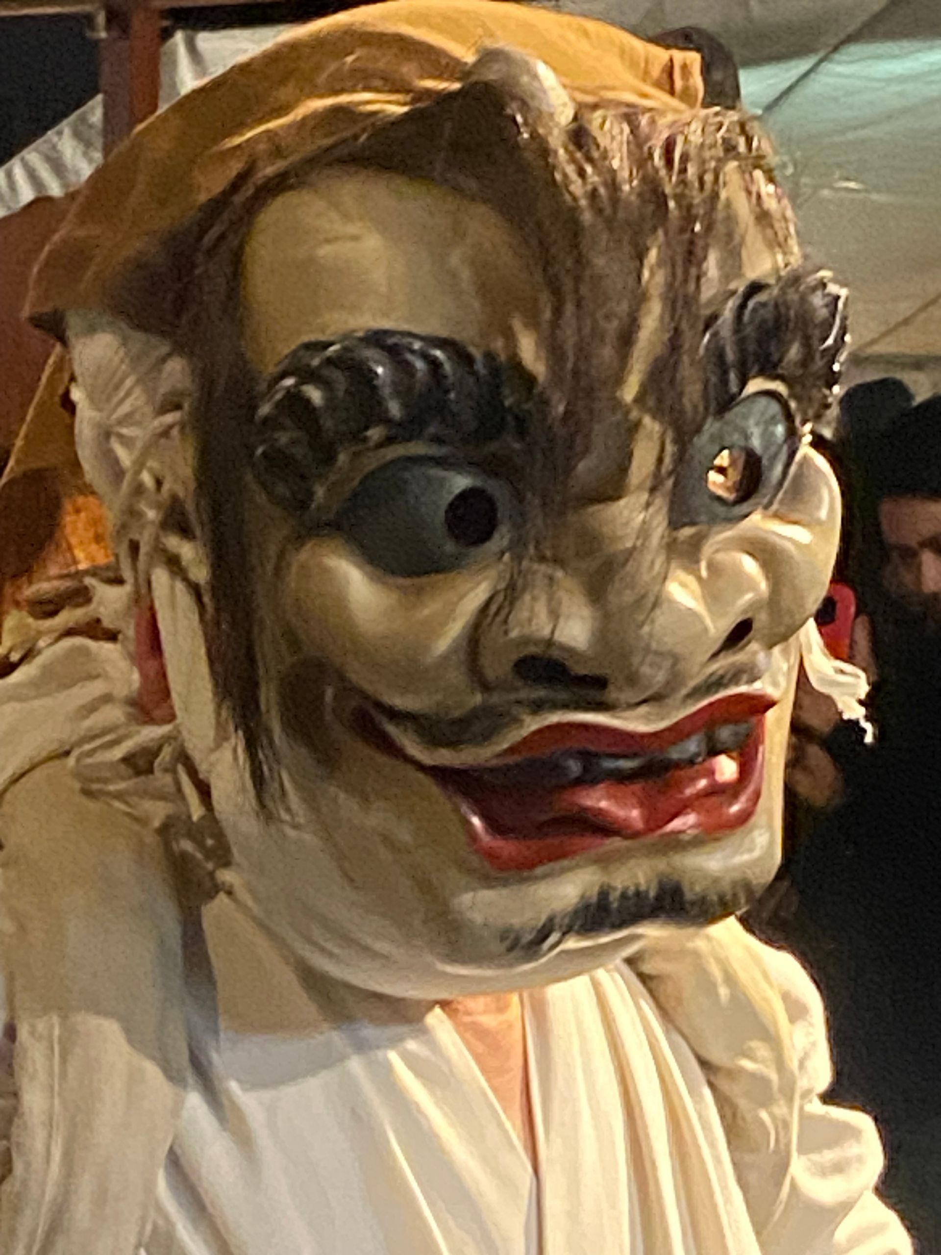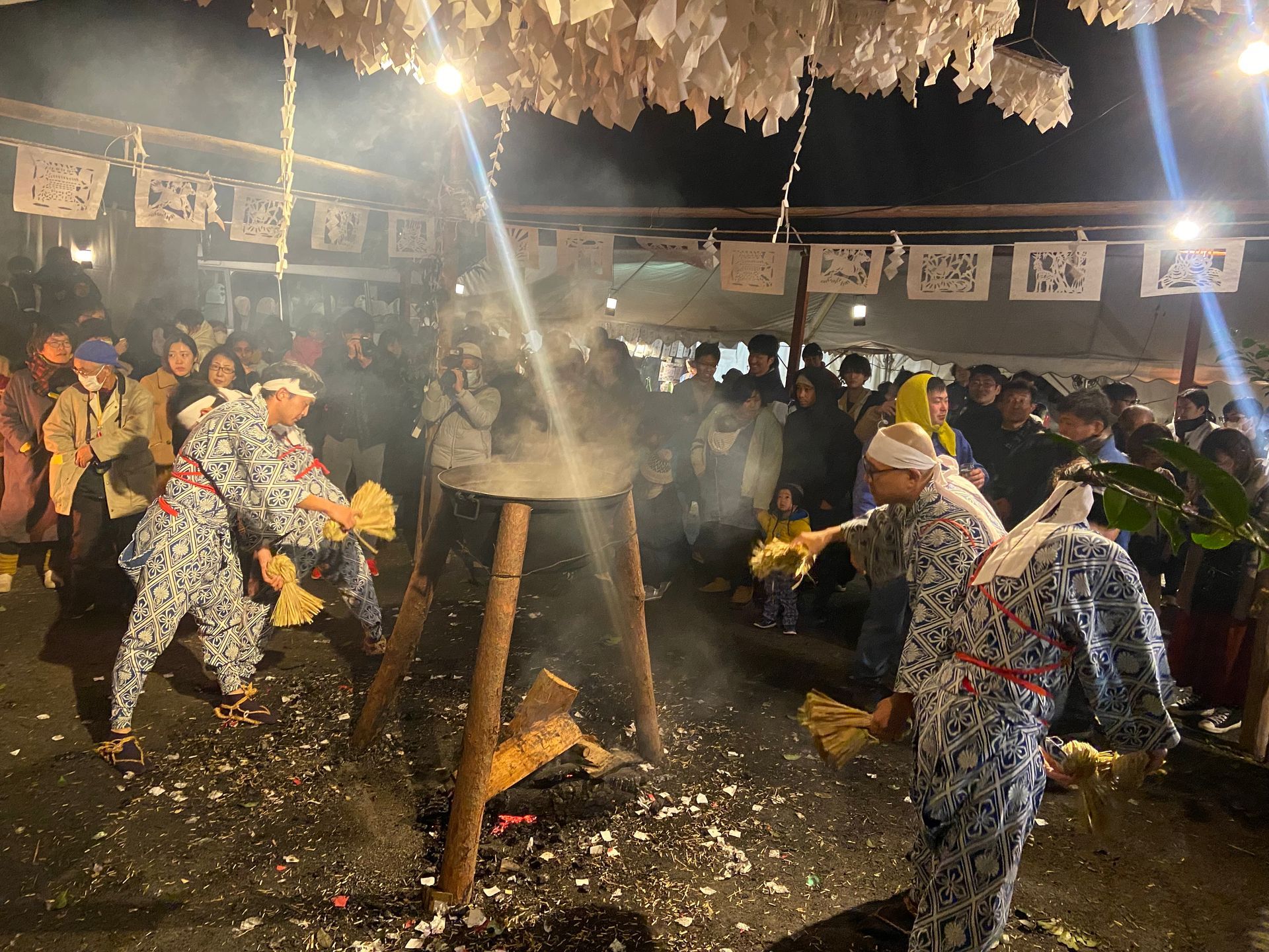 Na het diner konden we deelnemen aan Hana matsuri. Een van oorsprong 700 jaar oud feest dat in dit dorp in een soort verkorte versie elke zaterdag in februari wordt gevierd ergens buiten op een feestterrein. Je wordt verwelkomd met amazake, de warme zo goed als alcoholvrije rijstdrank met gember. Er wordt gedanst door vriendelijke ‘oni’ (duivels en demonen) samen met het publiek, waarbij men met takken groen door de lucht zwaait en ‘teehohe, tehohe’ roept, waarvan niemand weet wat het betekent.